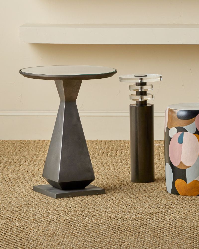 The Janil Accent Table is a generously sized side table forged from cast aluminum with a handsome graphite finish. The geometric shape will make it a striking decorative element in a room while the glass inset into its top will bring confidence that morning coffee or evening wine can be sipped without concerns.