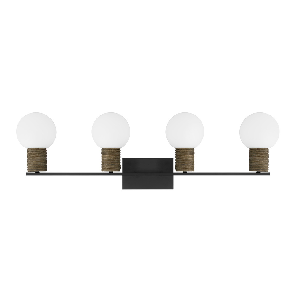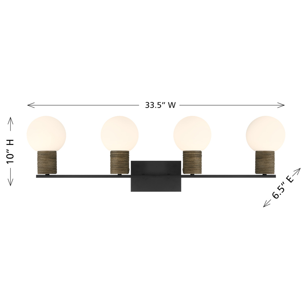 Make a bold style statement with the Savoy House Jarrell 4-light vanity light. Dark rattan detailing contrasts beautifully with white opal glass and a Matte Black finish, bringing texture and modern style to the space. Jarrell is 10" tall, 33.5" wide and extends 6.5" from the wall. It uses four candelabra size bulbs of up to 60 watts each (bulbs not included).