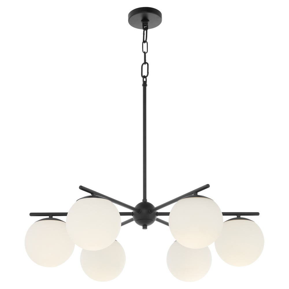 Part of the Main Street collection, the Jasper collection showcases a modern hub-and-spoke design with round globe shades and clean symmetry. Available in matte black or satin nickel and offered in both 3-light and 6-light configurations, it’s designed to suit a range of modern interiors.