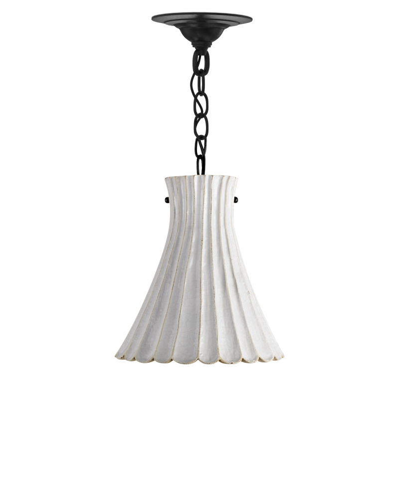 Gently flaring outward, the Jazz Pendant has a fluted silhouette that culminates at the bottom in scallops to dress up the retro-inspired fixture. A snowy white crackle finish covers the hand-thrown terracotta shade to give the pendant a simple modern look. This is one of our offerings that is perfect for clustering or hanging in rows for an even jazzier flair.