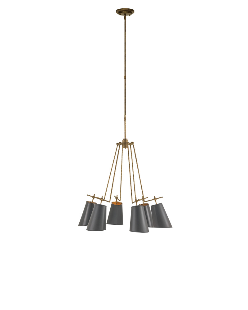 Wrought iron and sheet metal form the kicky Jean-Louis Chandelier, which has shades made to resemble those of a classic task light. These give it the feel of a mid-century modern icon. The exteriors are hand-finished in Marbella black while the interiors exude a warm reflection thanks to our contemporary gold leaf finish. This six-light chandelier is both timeless and functional.