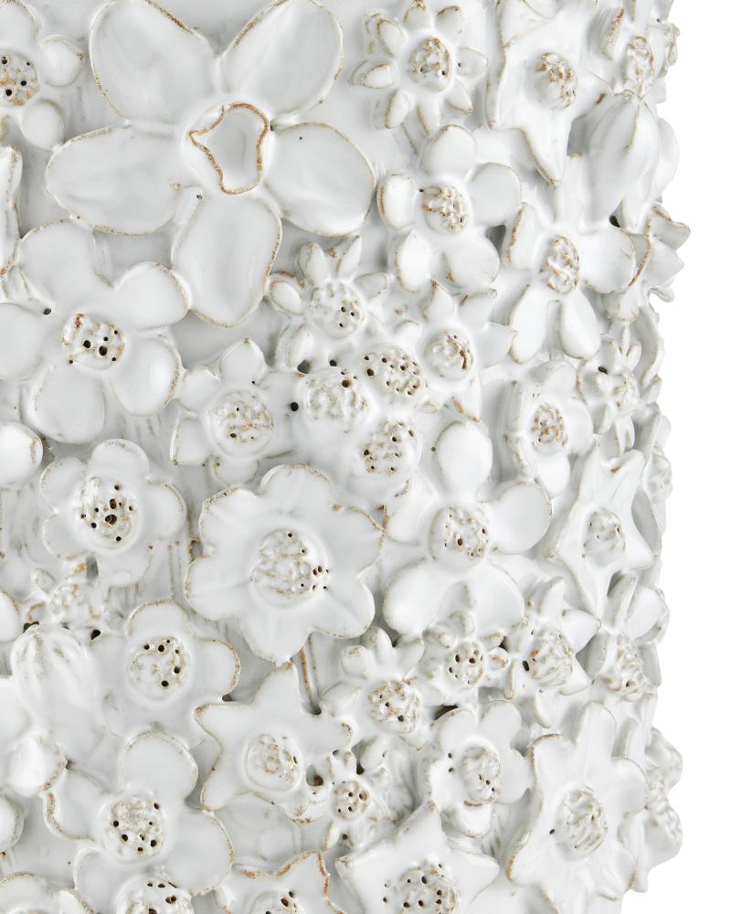 With a surface that is studded with beautifully fashioned white flowers, the Jessamine Small White Cachepot is truly an artisanal piece. Rather than apply one type of bloom, a number of floral shapes are intermingled to give the white decorative accessory a charm. The handmade character of the piece comes from the fact that each flower is created individually and applied, one-by-one, by hand. The white planter will be a plant's biggest complement.