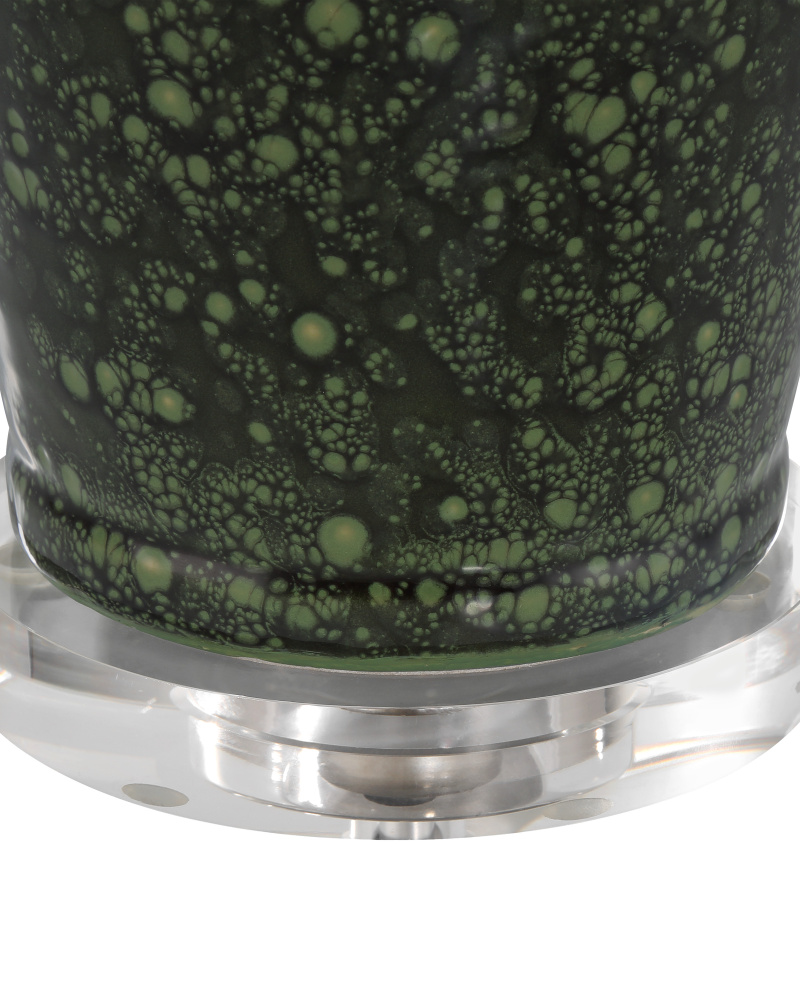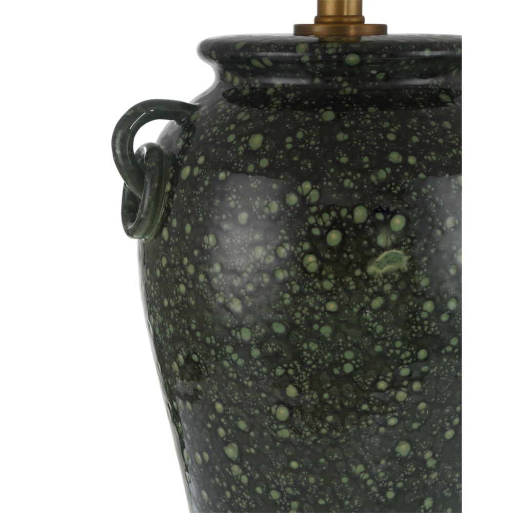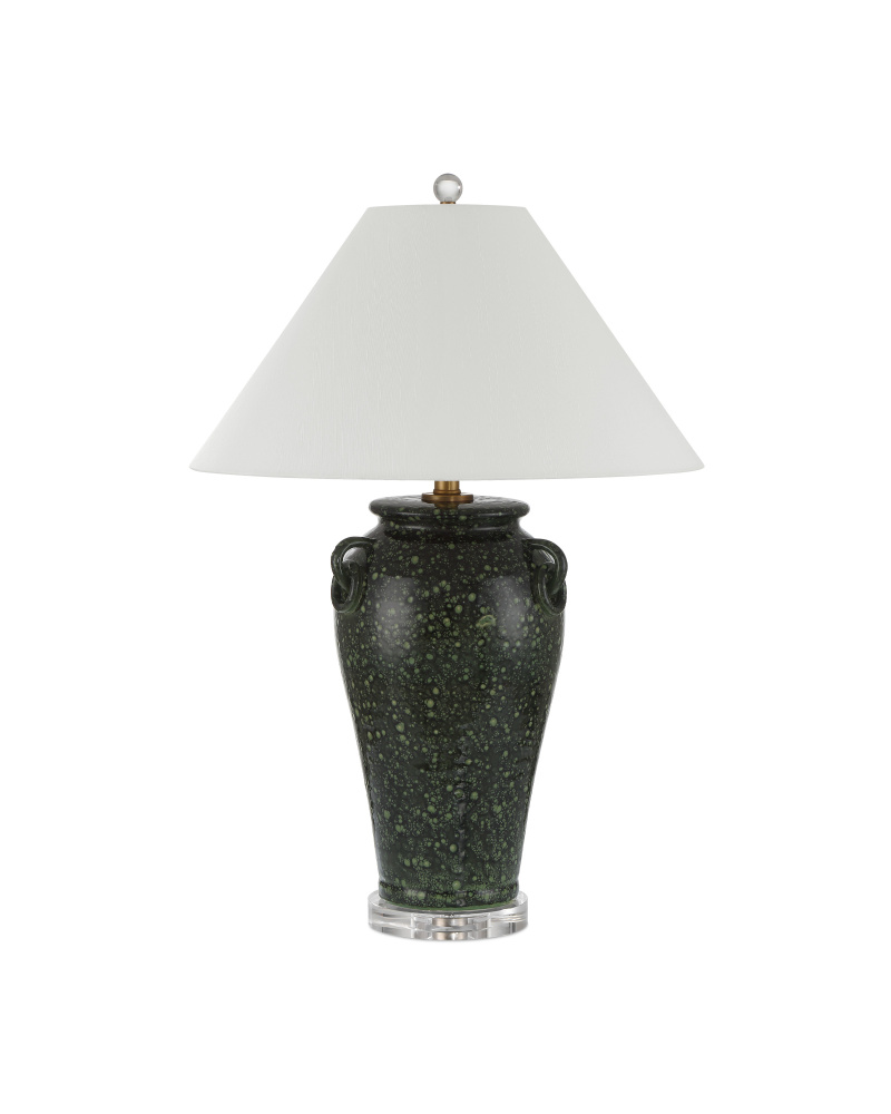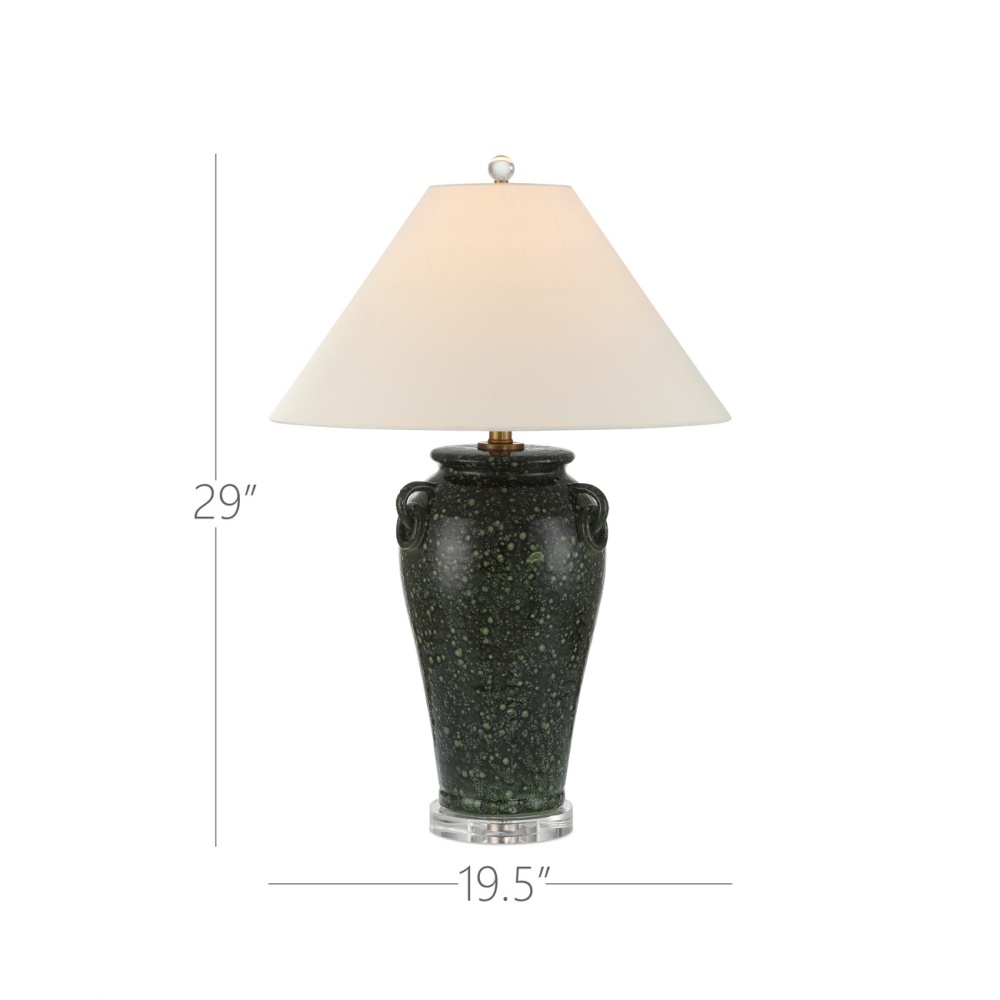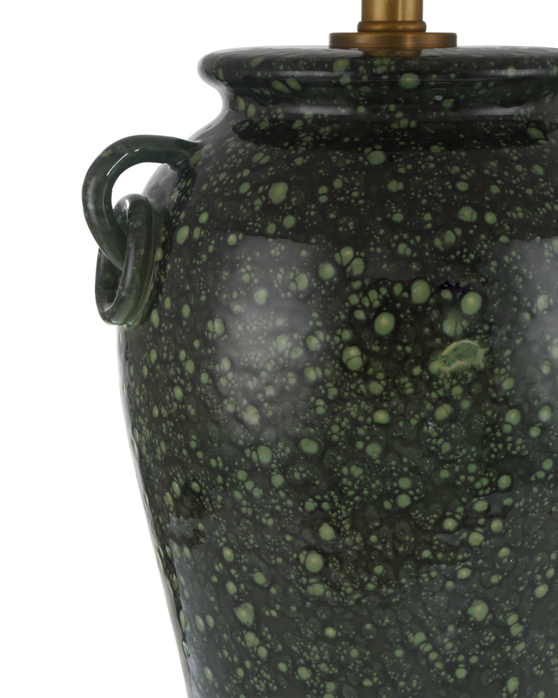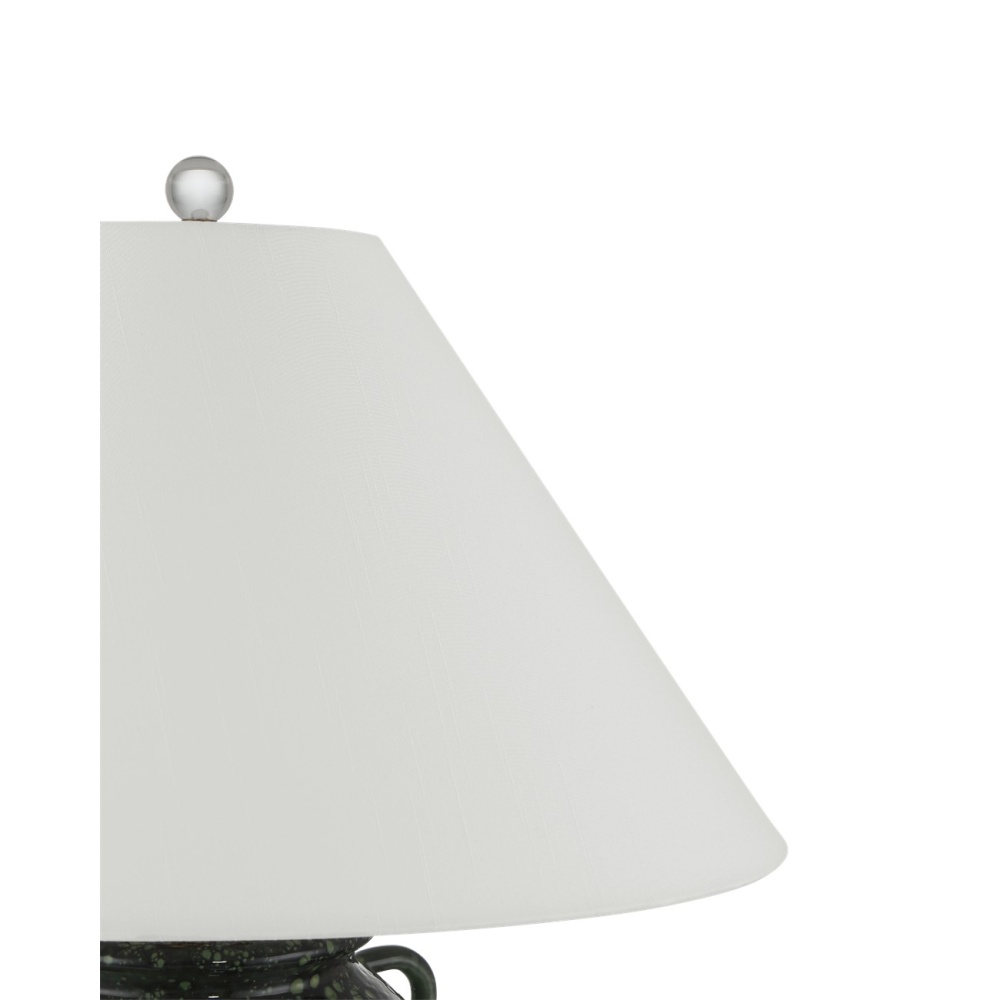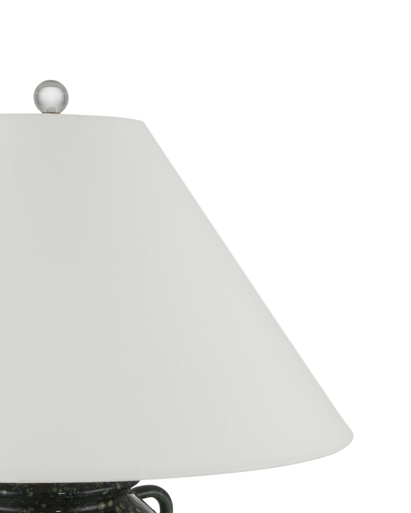 The Junko Green Table Lamp has an amphora-shaped body made of terracotta with a mottled green glaze achieved when the oxides cause tiny bubbles during the firing process. This is an artisanal treatment that brings the lamp tremendous texture. The antique brass hardware is a warm element while the optic crystal base and metal finial bring a contrasting brilliance. The pale flared empire shade is a sophisticated touch.