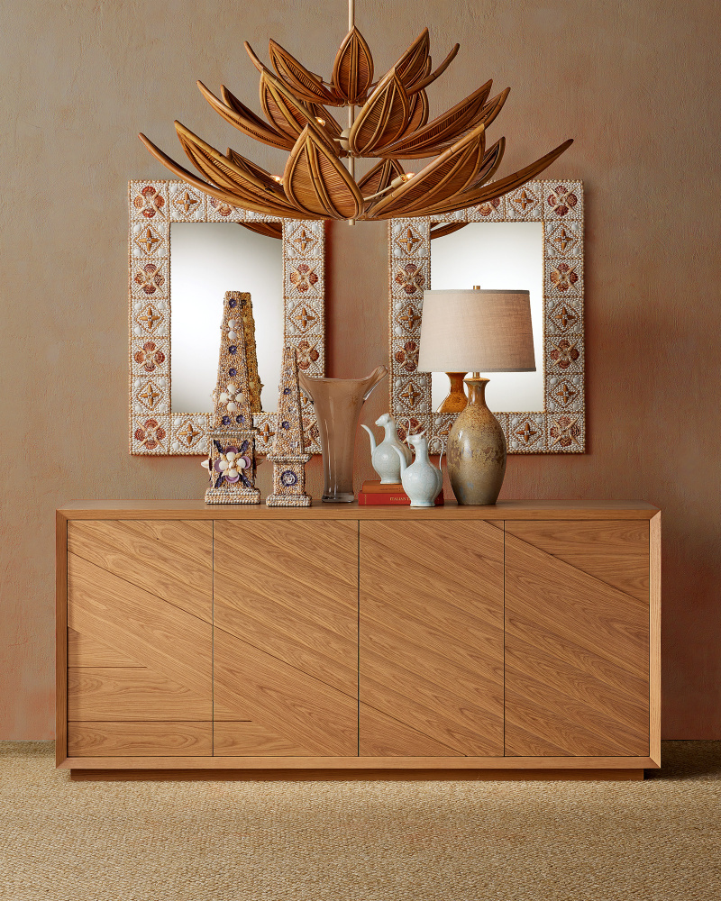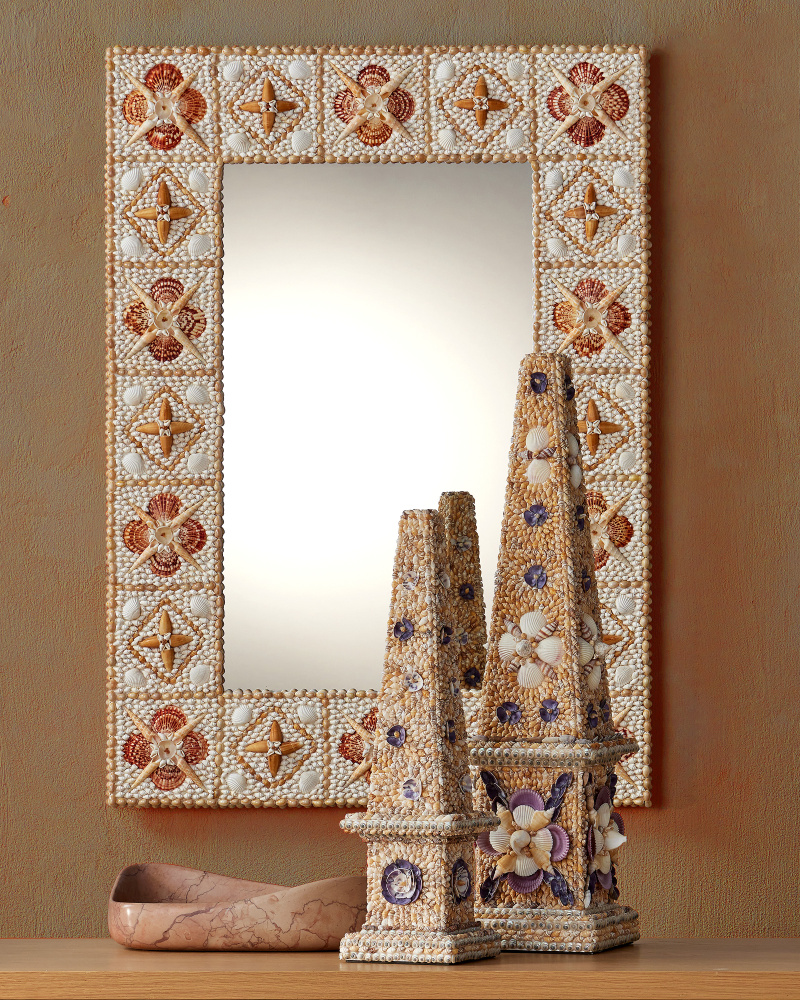 The Junonia Rectangular Mirror has a shell-encrusted frame inspired by a mosaic wall created in coquillage, one of the world’s oldest art forms that utilizes natural shells. The complex pattern, which includes floral motifs in pale peach, white, and purple tones, is affixed to the frame made of wood. Each decorative mirror, which includes cleats for hanging horizontally or vertically and extra shells for spot repairs, will vary slightly given the shells are natural.