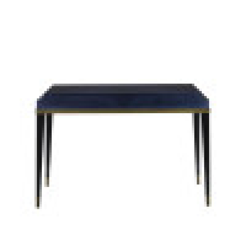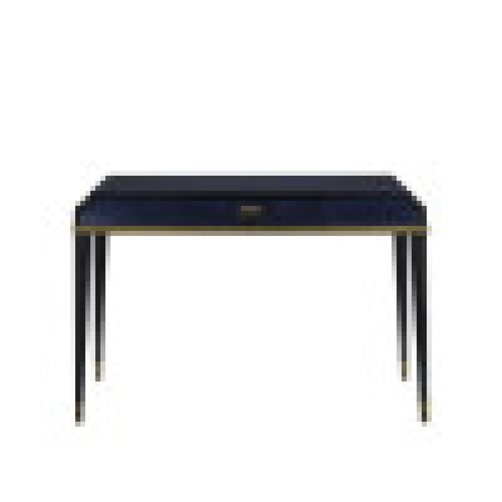 The Kallista Blue Writing Desk has a dark sapphire blue finish that enlivens the sycamore veneers on its top and sides. The wood grains bring the navy blue desk a hint of distressing that contrasts the sleek lines of the door pulls in an antique brass finish and the glossy caviar black finish on the desk's legs.