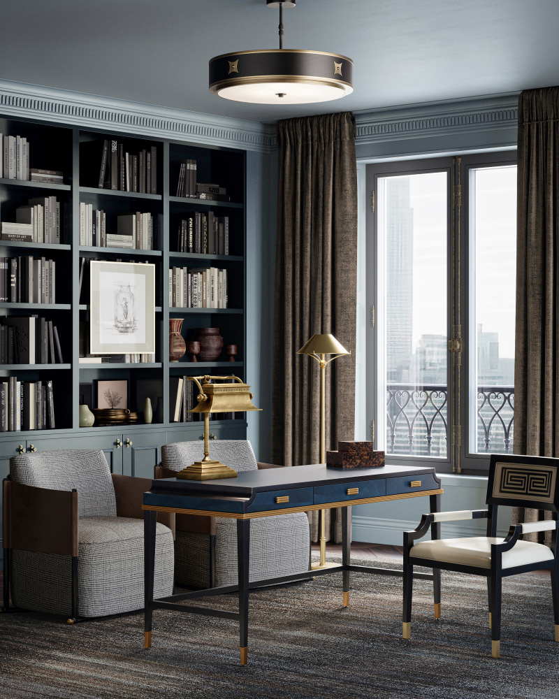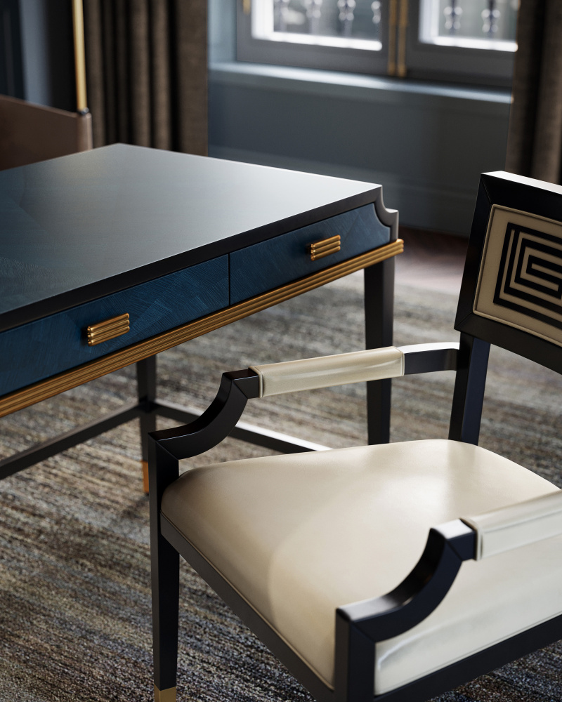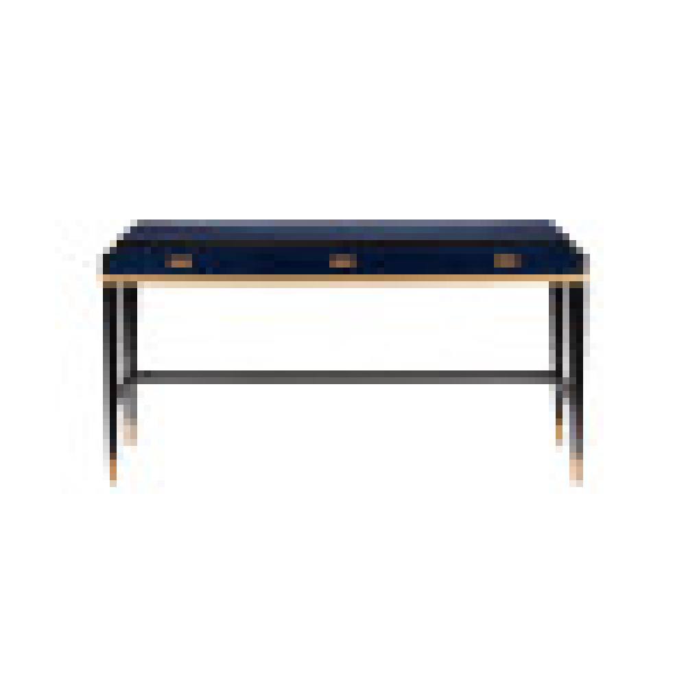 The Kallista Large Blue Desk is a grander version of the smaller writing desk to provide more surface area with equal panache. The mix of dark sapphire and glossy caviar black finishes enlivens the sycamore veneers, and the woodgrain brings the cabinet a hint of distressing. The sleek lines of the piece seem even more tailored thanks to the antique brass detailing. The shape of the door pulls echo this accent. Design details include brass ferrules and soft-close door hinges.