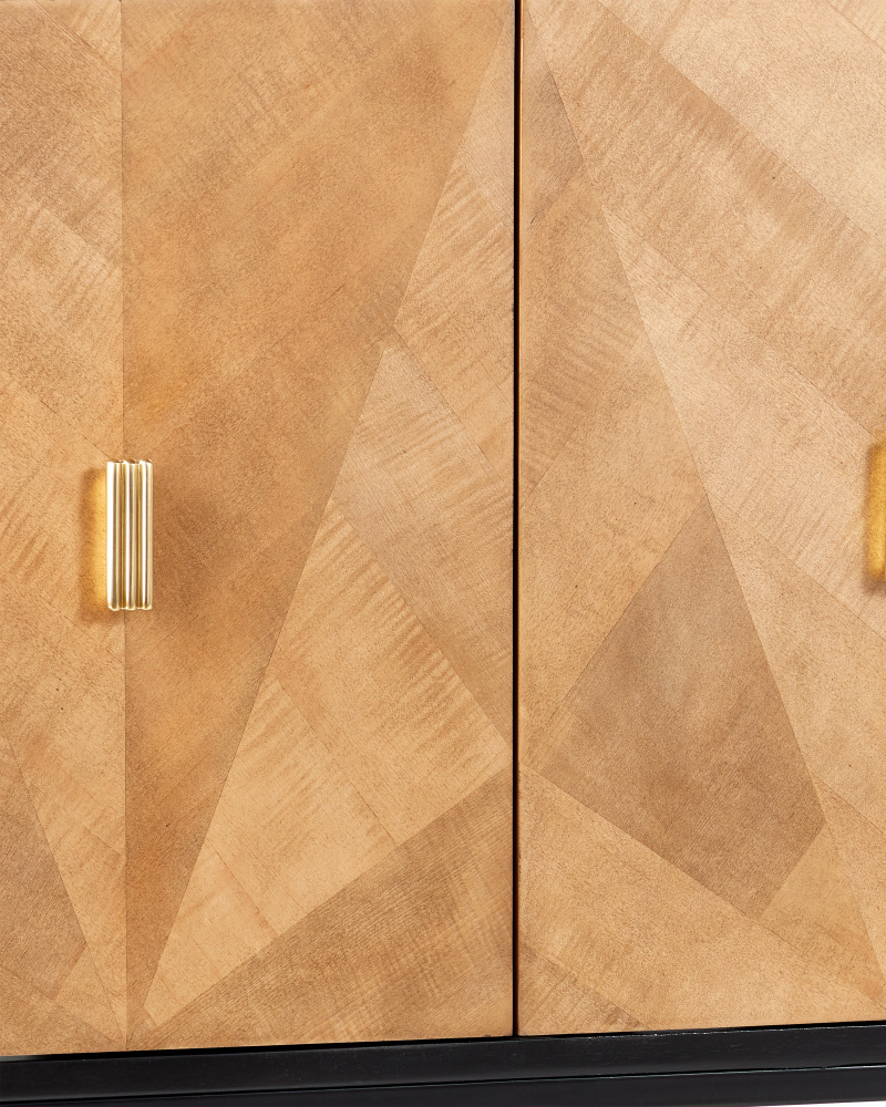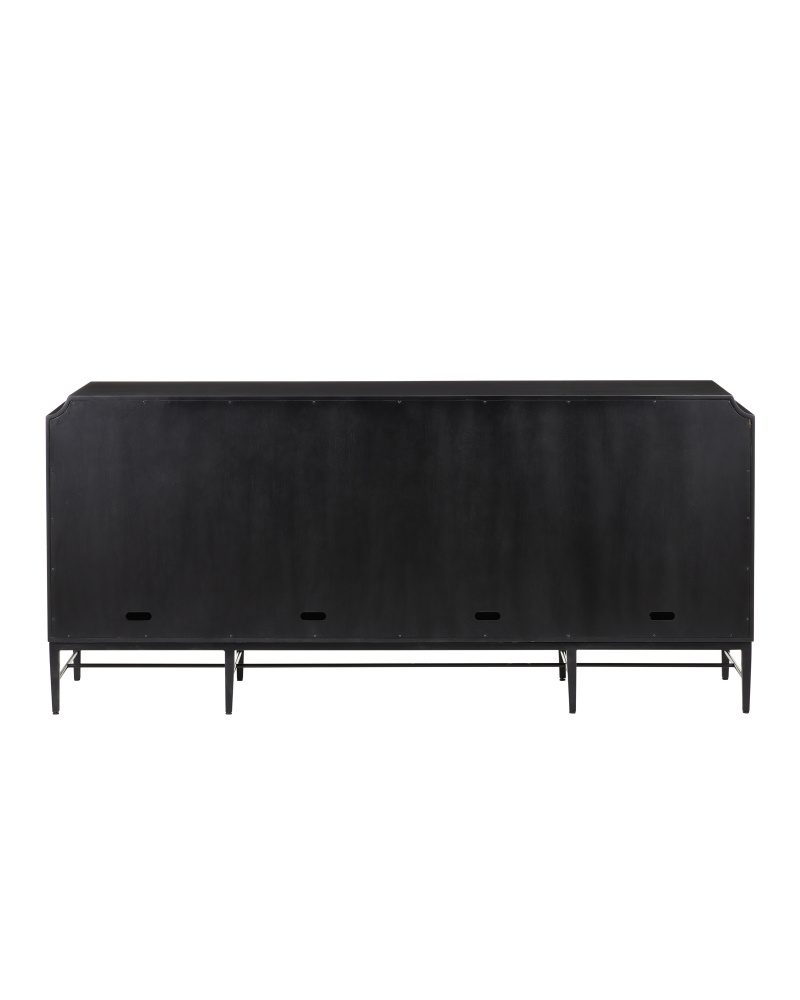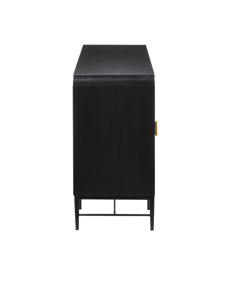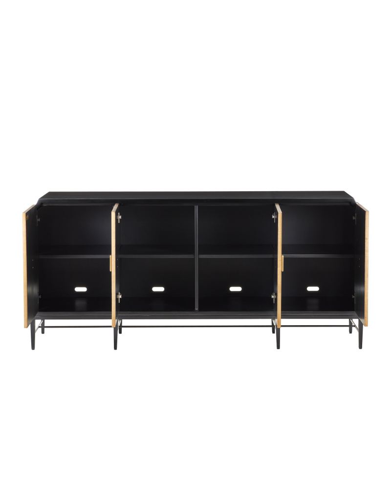 The Kallista Taupe Credenza has a taupe finish that enlivens the figured sycamore veneers on its door fronts. The wood grains bring the credenza a hint of distressing that contrasts the rich black of the cabinet's exterior. The door pulls are in a polished brass finish. Specialty treatments on this artful tan chest include soft-close doors and cord management openings.