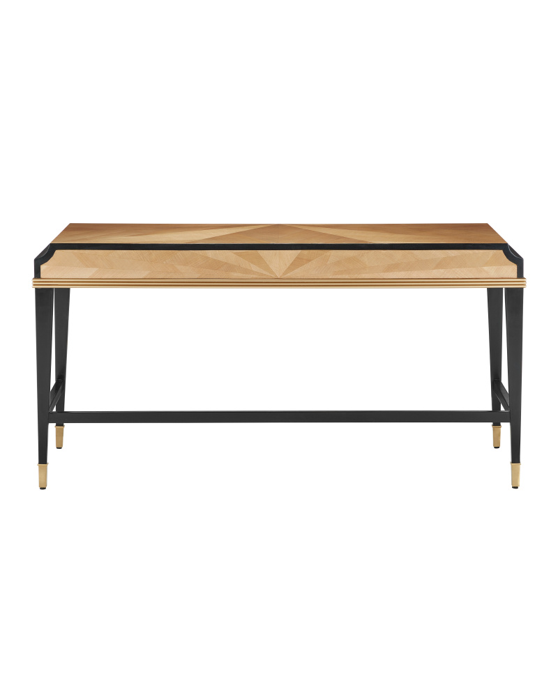 The Kallista Large Taupe Desk is clad in sycamore veneers with a beautiful taupe finish that enlivens the wood grains on the top, sides, and drawers. The shape of each of the cast brass door pulls mimics the scale of the detail below the drawers. The legs and delineated details that run along the top edge of the front and sides of the desk are made of mahogany in a caviar black finish and the tailored ferrules are in a polished brass finish. Specialty treatments include wood drawer slides, a fully-finished back, and faux velvet drawer liners.