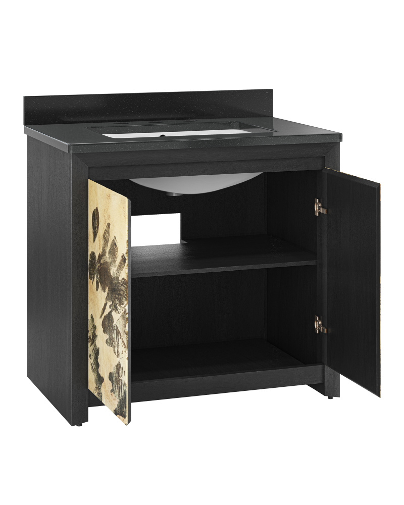 The Karlson 36” Bath Vanity has doors clad in a composition of organic patterns that look like an abstract painting applied to faux vellum. The vanity, the rest of which is painted in a Caviar black, is raised a bit in the front to bring its profile a refined detail, as does the black granite top with a rectangular undermounted sink. The interior offers practical storage solutions, including one adjustable shelf and two optional wood trays that attach to the inside of the doors for customizable organization.