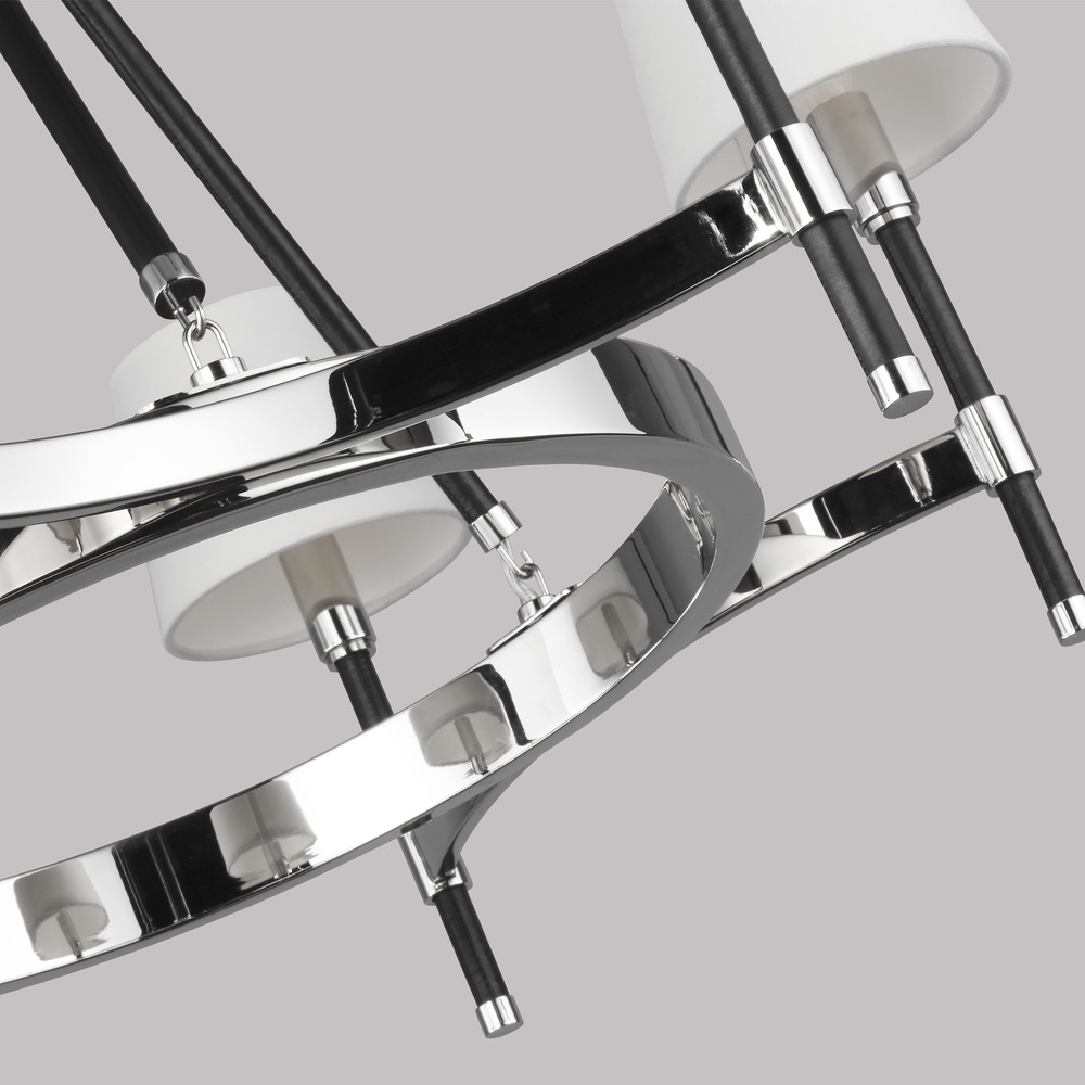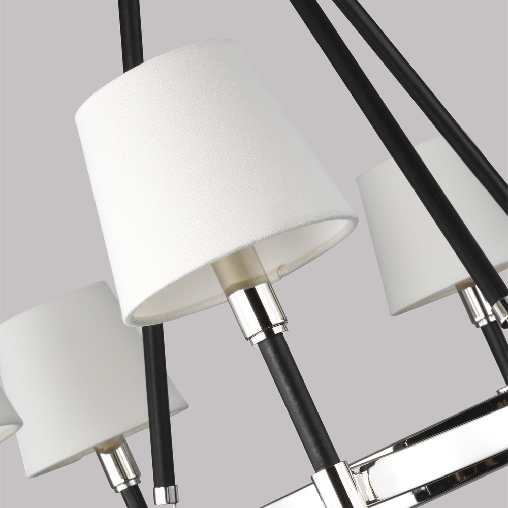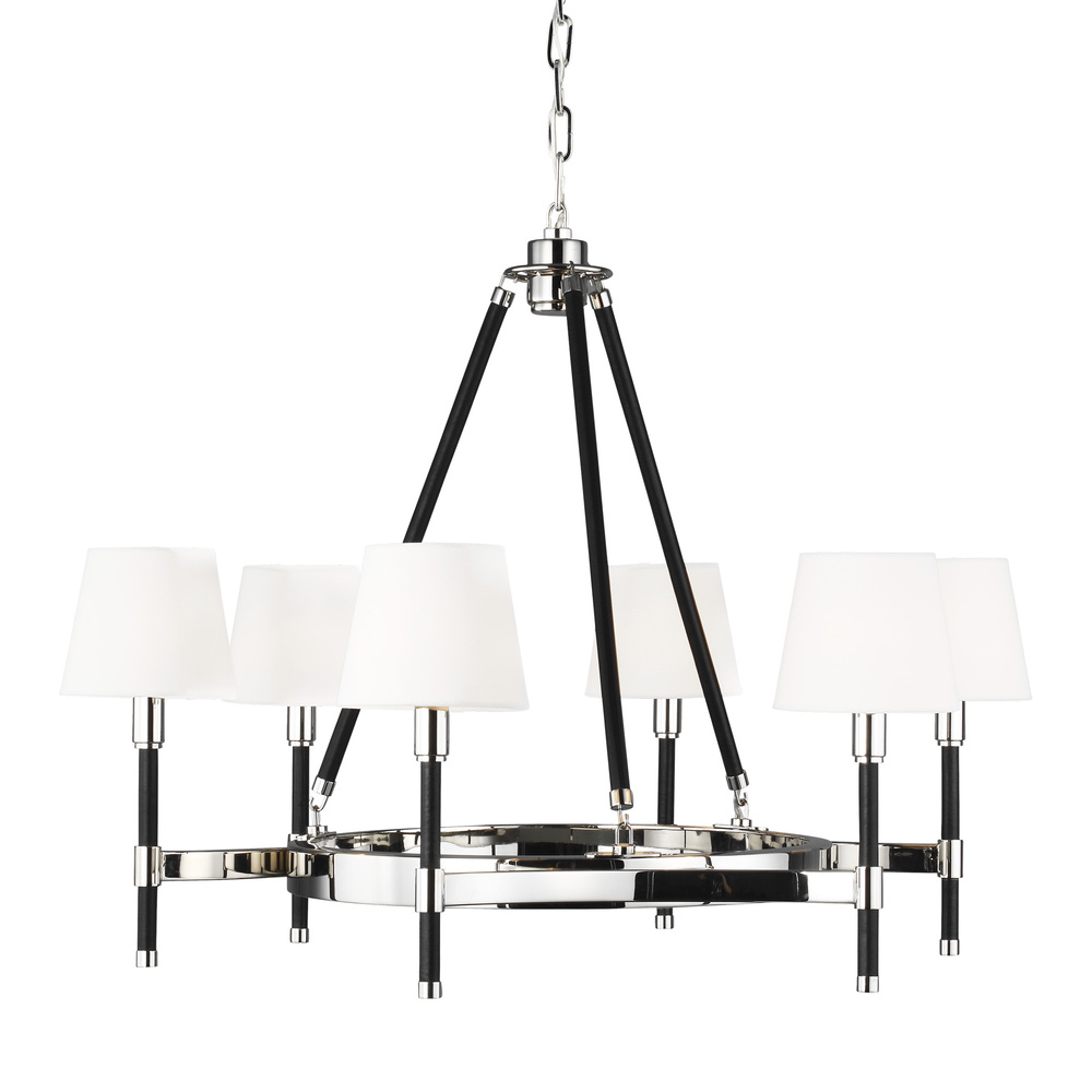 The Katie six light single tier chandelier in polished nickel features leather straps suspended from the chain to round out the design of this timeless series.