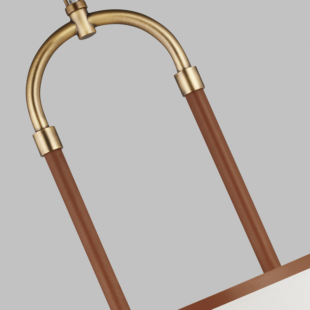 In the Katie one light shade pendant leather straps contrast with metal and white linen fabric shade to round out a timeless design. Available in: Time Worn Brass with Brown Leather or Polished Nickel with Black Leather. The combination of leather and steel gives this round chandelier equestrian flair.