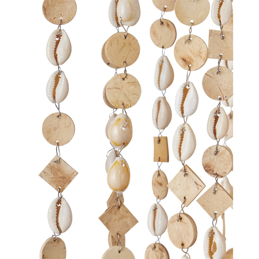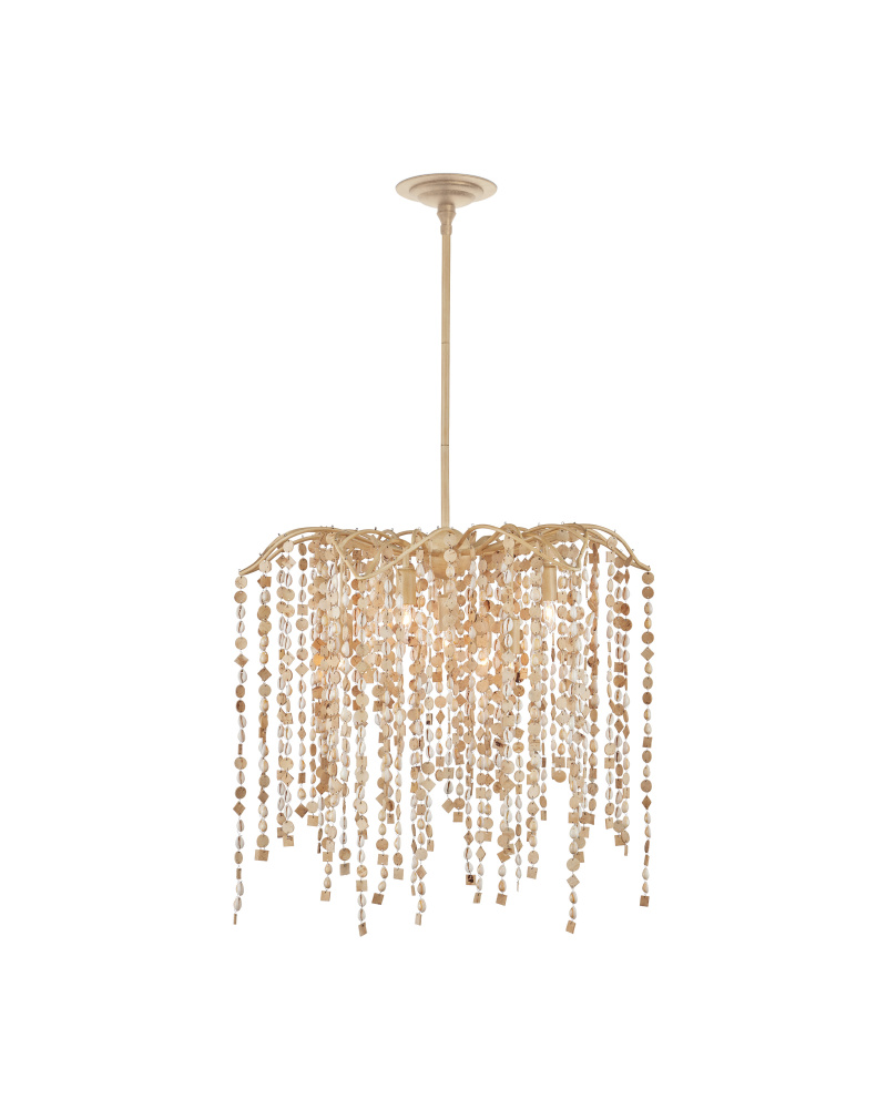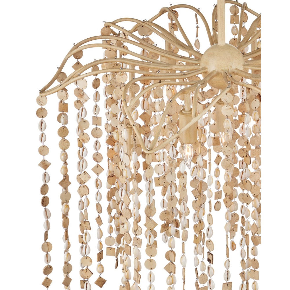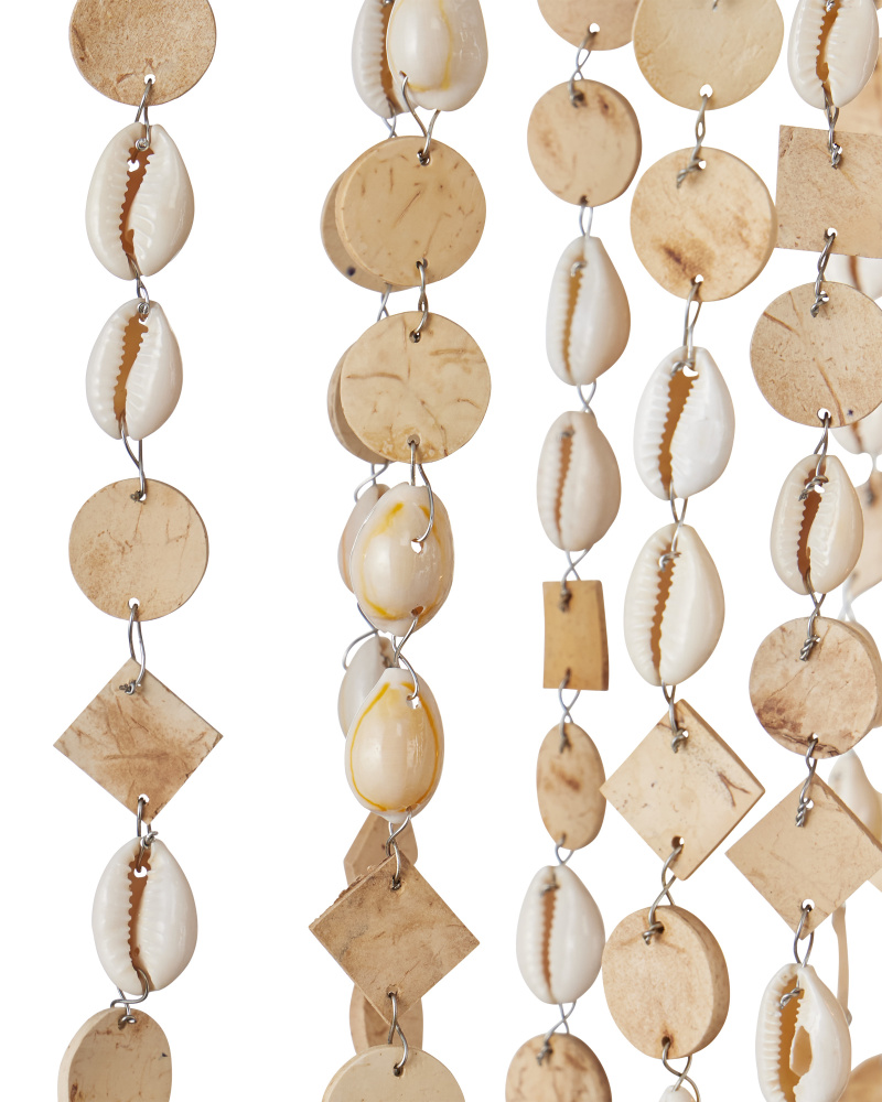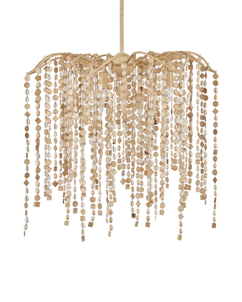 The Kealia Medium Chandelier drips with hand-beaded natural cowrie shells and small pieces of coconut shells that flow down from an undulant floral-shaped frame to make it a biophilic design. The natural materials form a veil-like shade that surrounds seven lights that create a patterned illumination. The curving frame is made of thin ribs of wrought iron in a coco cream finish to complement the earthy tones of the natural materials. Adjustable from 30" to 72" with use of included chain/rod kit/cable. If your space calls for a longer drop, additional chain/rods/cable is available for purchase.