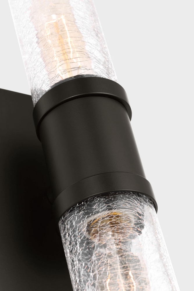 Sleek and modern, this 2-Light bath series pairs a square backplate With tubular clear crackle glass shade. The Keaton two light vanity fixture provides abundant light for your bath vanity, while adding a layer of today's style to your interior design.