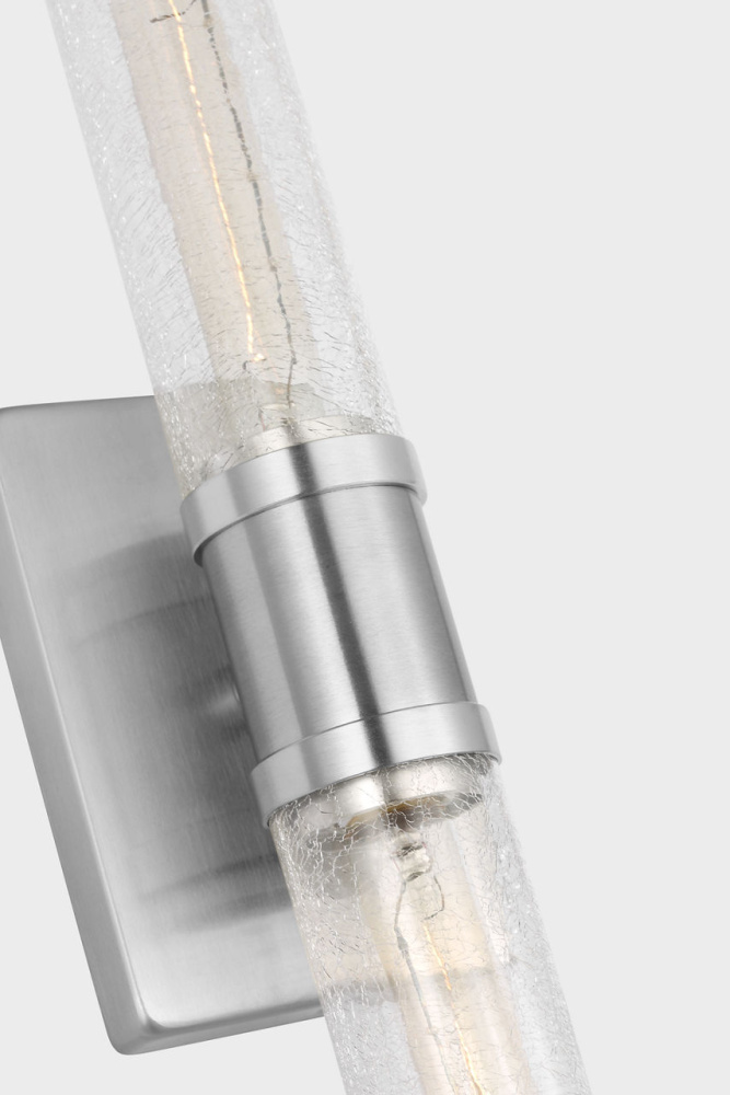Sleek and modern, this 2-Light bath series pairs a square backplate With tubular clear crackle glass shade. The Keaton two light vanity fixture provides abundant light for your bath vanity, while adding a layer of today's style to your interior design.