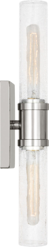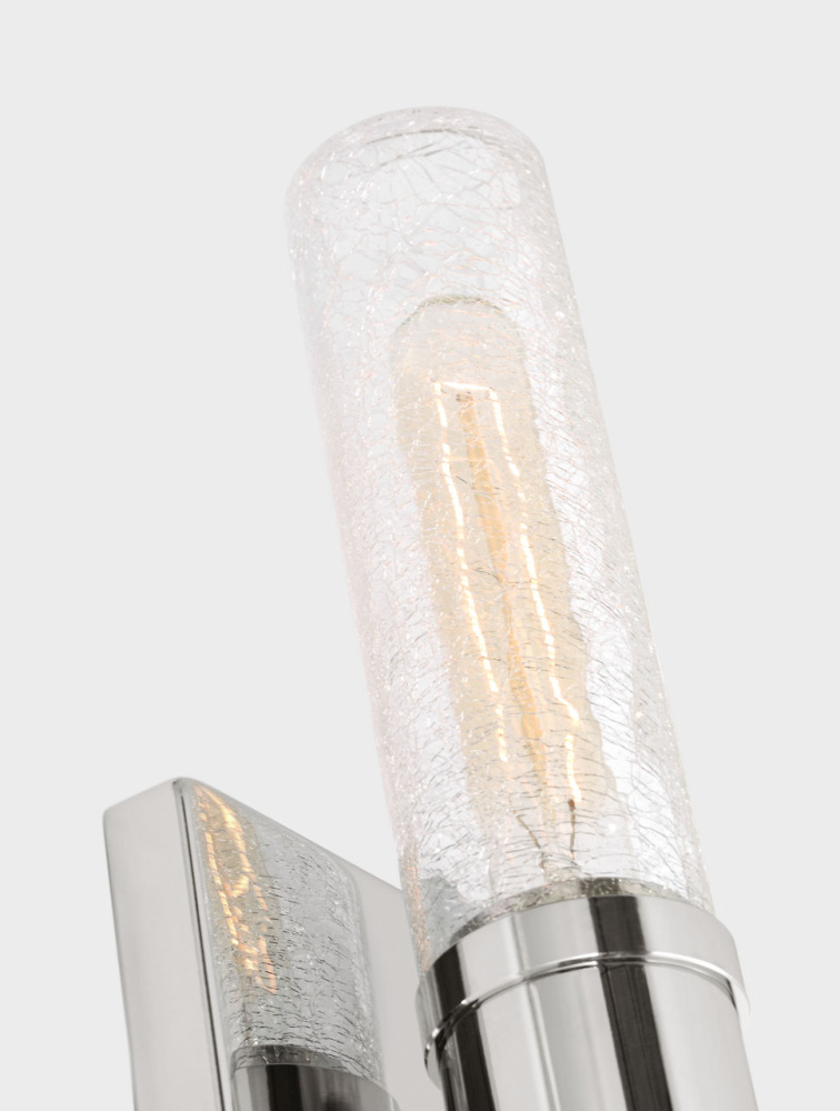 Sleek and modern, this 2-Light bath series pairs a square backplate With tubular clear crackle glass shade. The Keaton two light vanity fixture provides abundant light for your bath vanity, while adding a layer of today's style to your interior design.