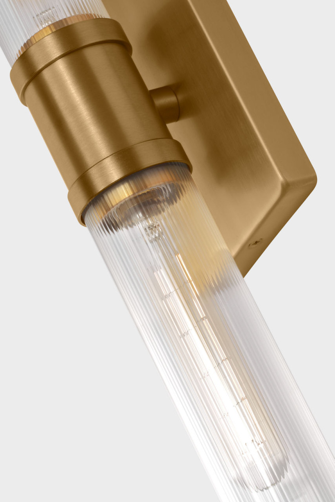Sleek and modern, this 2-Light bath series pairs a square backplate With tubular clear fluted glass shade. The Keaton two light vanity fixture provides abundant light for your bath vanity, while adding a layer of today's style to your interior design.