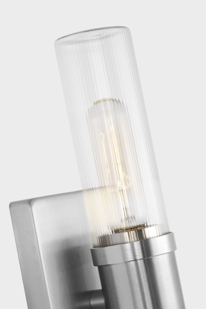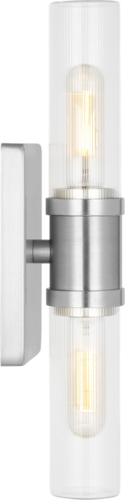 Sleek and modern, this 2-Light bath series pairs a square backplate With tubular clear fluted glass shade. The Keaton two light vanity fixture provides abundant light for your bath vanity, while adding a layer of today's style to your interior design.