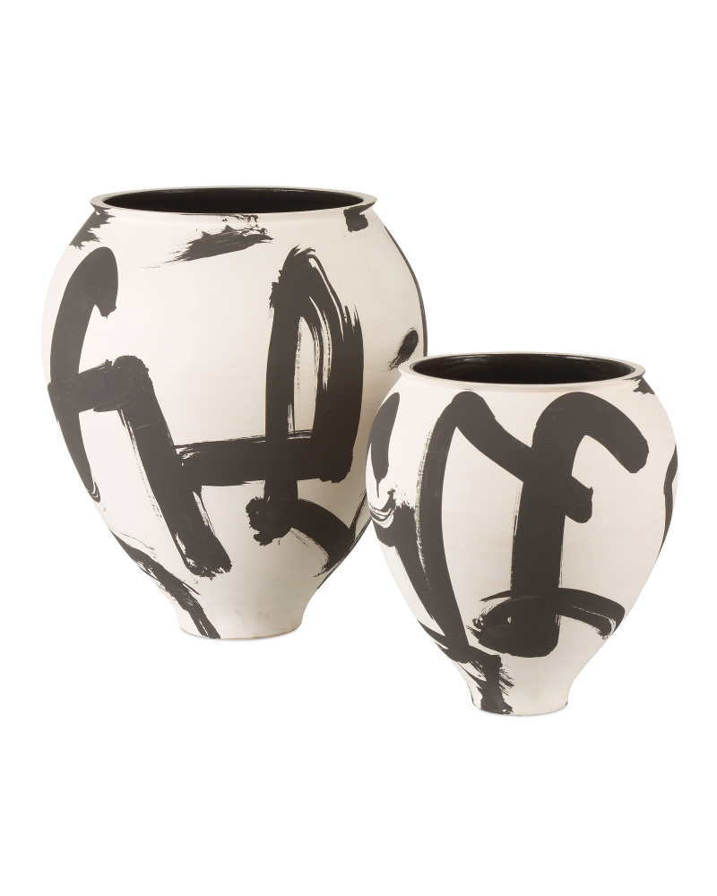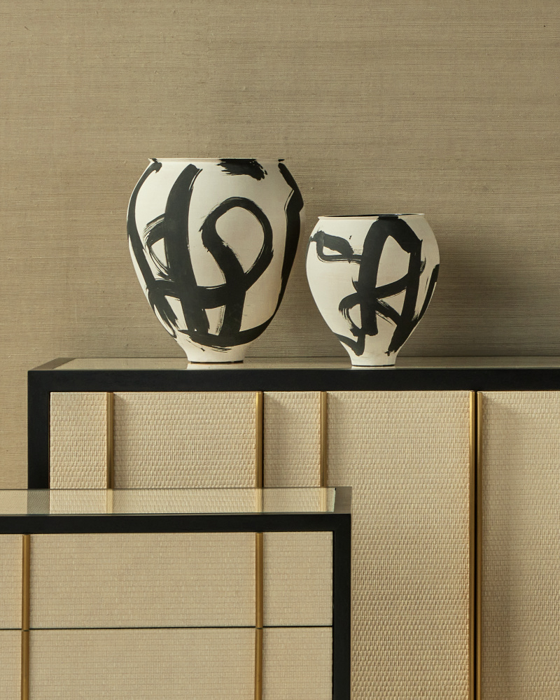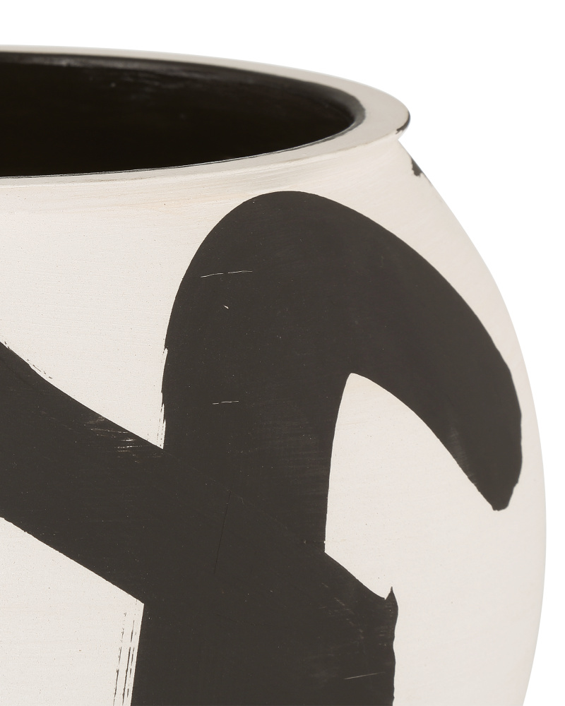 The sketched pattern on the surface of the Kenzo Large Vase was inspired by the art of Imperial Japan, particularly the Enso, a prolific symbol in the Zen practice of painting. Made of porcelain, the black and off-white vessel is finished on the inside; and it is hand-thrown, hand-glazed, and hand-decorated so the patterns on each vase will vary slightly.