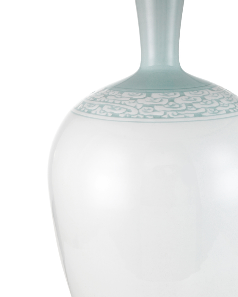 The baluster shape and Ming-Dynasty motifs on the Ketty Green Table Lamp bring it a classic Chinoiserie feel that is echoed by the double-trimmed shade. The porcelain body is white where it is left unpainted, the celadon glazing that depicts cloud motifs defining its timeless style. The polished nickel finial crowns this lamp.