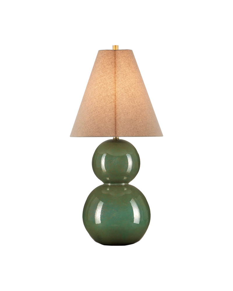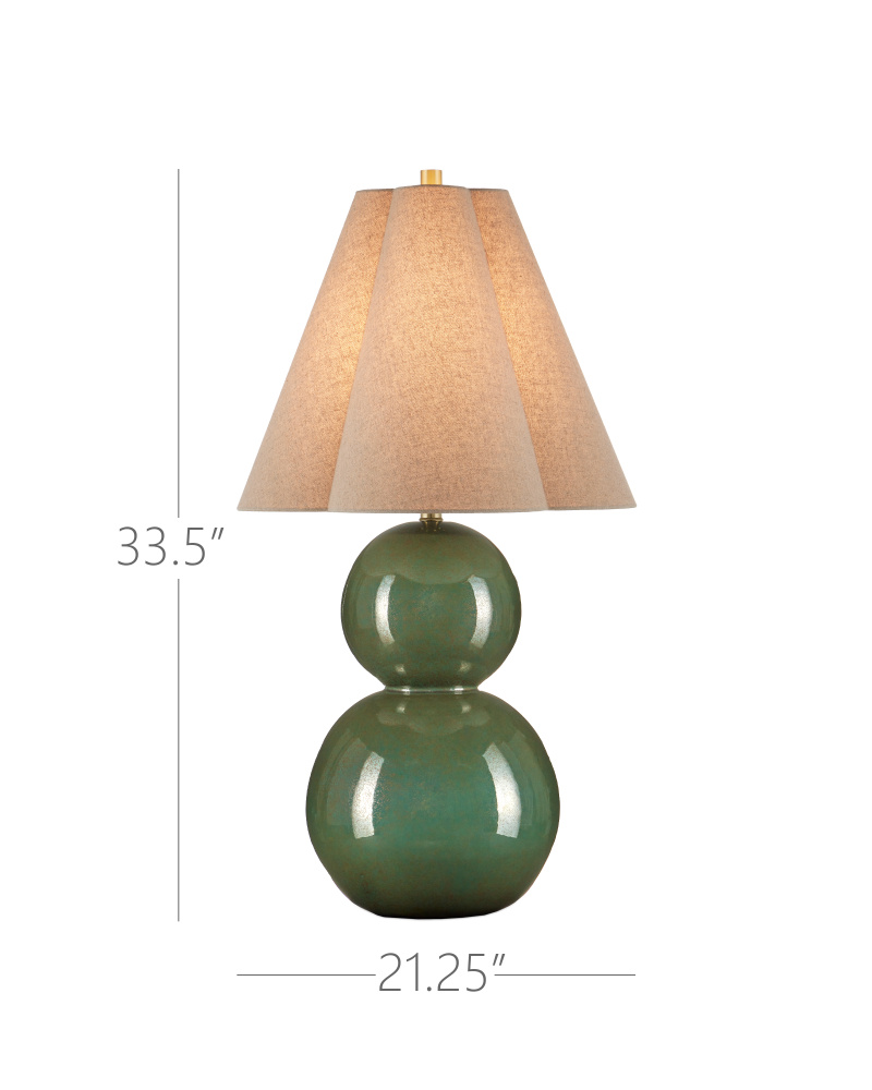 The Kindred Table Lamp is a double stacked-orb lamp made of ceramic onto which dark green glazes have been applied to create a mottling effect. Though the color achieved is deep toned, it is also quite glossy to give it tremendous sheen. Topped with a clover-shaped shade that narrows as it rises, this generously sized green lamp at thirty-four-and-a-half-inches tall will be a statement piece in a room.