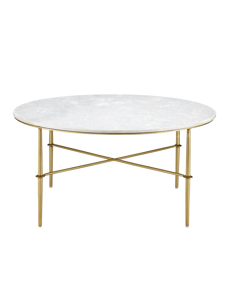 The Kira Marble Cocktail Table is a classically designed gold and white coffee table with modern lines thanks to the tapering of the legs at top and bottom and the clean-lined stretchers. Made of iron in an antique brass finish, the gold cocktail table is topped with a disc of white marble that ups the ante on its sophistication. Introducing an enhanced sense of refinement are the circlet details where the stretchers clasp each of the four legs.