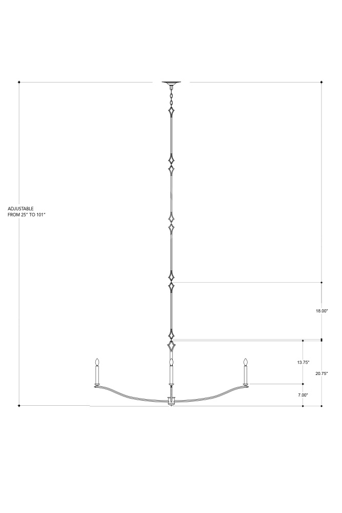The Knole Chandelier gleans its simple beauty from the minimalistic design of its wrought iron frame. This is heightened by the chain-link detail ornamenting the top of the stem from which it hangs. of particular note on this black chandelier in a French black finish is how subtly the arms curve. Adjustable from 25" to 101" with use of included chain/rod kit/cable. If your space calls for a longer drop, additional chain/rods/cable is available for purchase.