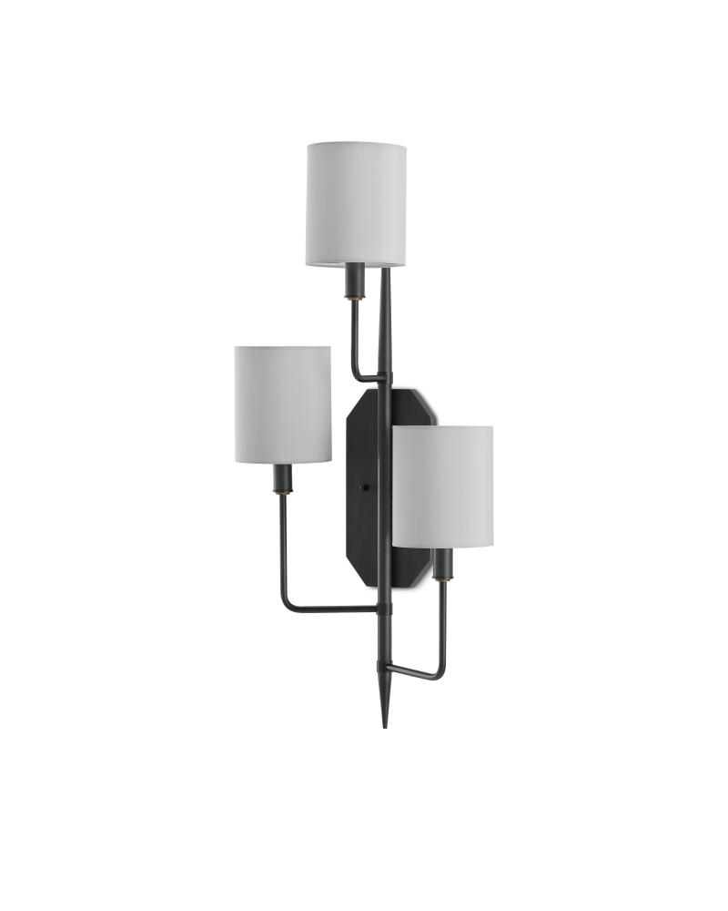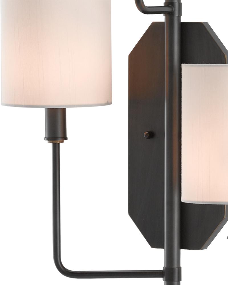 The Knowsley Left Wall Sconce has a thin armature in an oil-rubbed bronze finish that holds three tailored off-white shantung shades. The thinness of the arms and stem make this sconce a light design until the dark finish was added to give the bronze sconce heft.