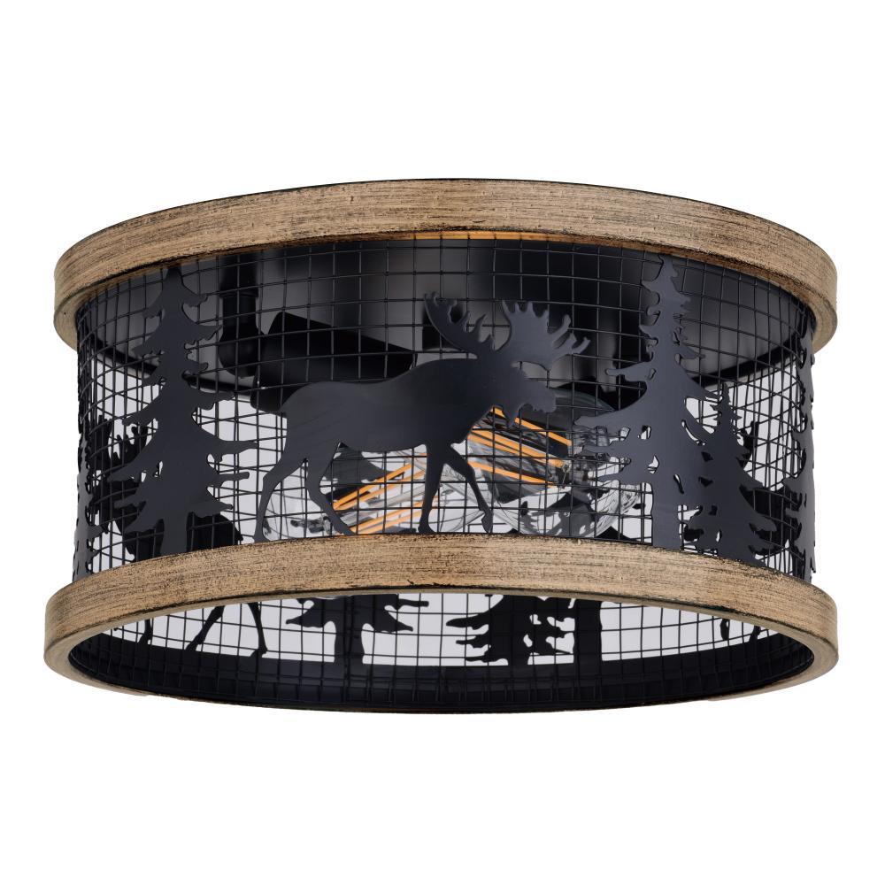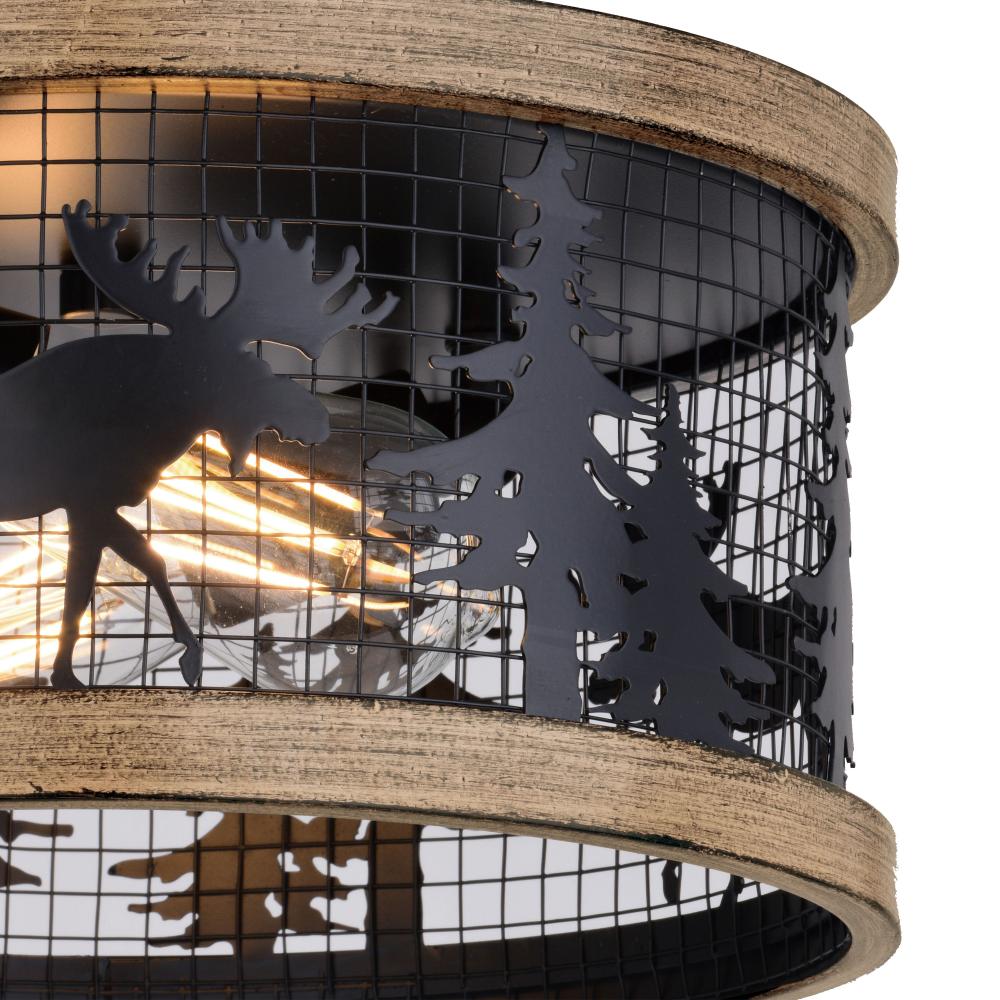 Get wild with this drum style ceiling light called Kodiak. The pairing of the black and burnished teak finish enhances the on-trend metal cage perfectly. Capture your love of nature with pine tree and moose silhouettes. It is an excellent choice for a vacation lodge, cabin or suburban home and complements a variety of home styles: anywhere you want to bring an element of nature. Rated for damp locations, it can be used in any bathroom, family room, or any other area of your home.