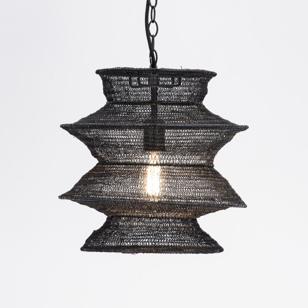 Airy yet impactful, Krabi brings sculptural movement and moody ambiance to any interior. Layers of black metal mesh form undulating rings that seem to float in place, tapering and expanding like a lantern in motion. When illuminated, the open-weave shade c