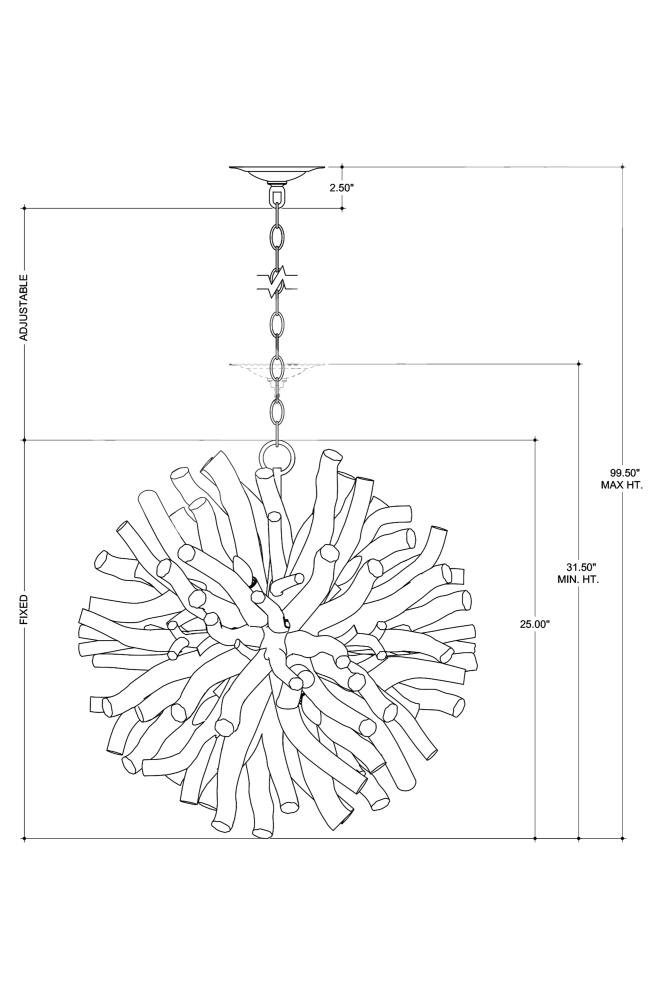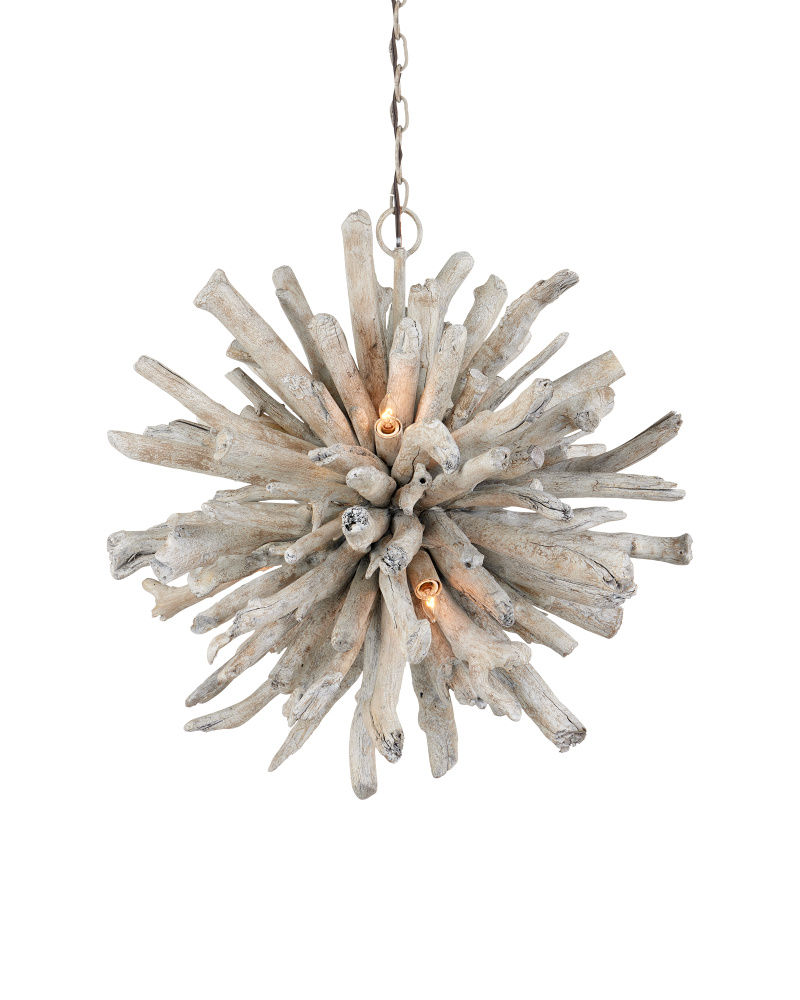The Kuka Pendant is a driftwood starburst in a whitewashed driftwood finish, which was designed by Marjorie Skouras to continue her celebration of the Yucatan Peninsula that she calls home. The tumbled wood pieces are fitted so carefully to the frame, the nature-inspired profile fools the eye into thinking it came from the elements in one piece. This natural-toned pendant is a perfect choice for coastal settings and lakeside retreats. Adjustable from 31.5" to 99.5" with use of included chain/rod kit/cable. If your space calls for a longer drop, additional chain/rods/cable is available for purchase.