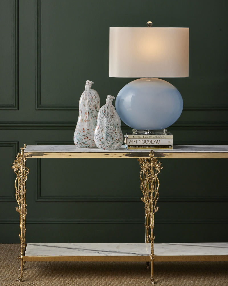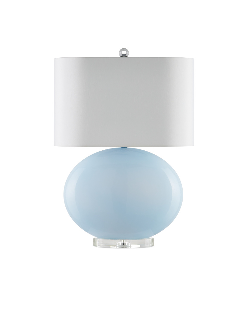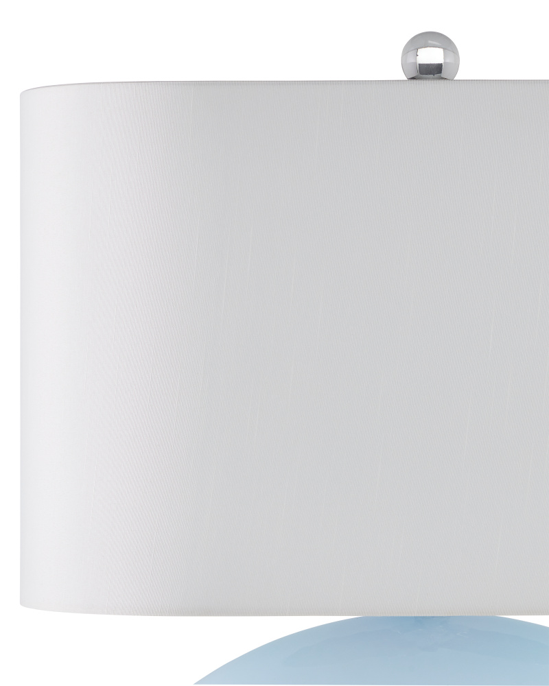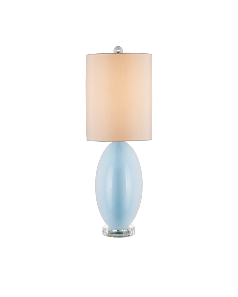 The Laconia Table Lamp is a luminous creation with a lozenge-shaped body made of light blue glass sitting atop an optic crystal base. The hardware is equally brilliant in a polished nickel finish, and a round optic crystal finial tops off the creation. This pale blue lamp is narrow, so it is a great choice for tables or cabinets without large or deep top surface spaces.