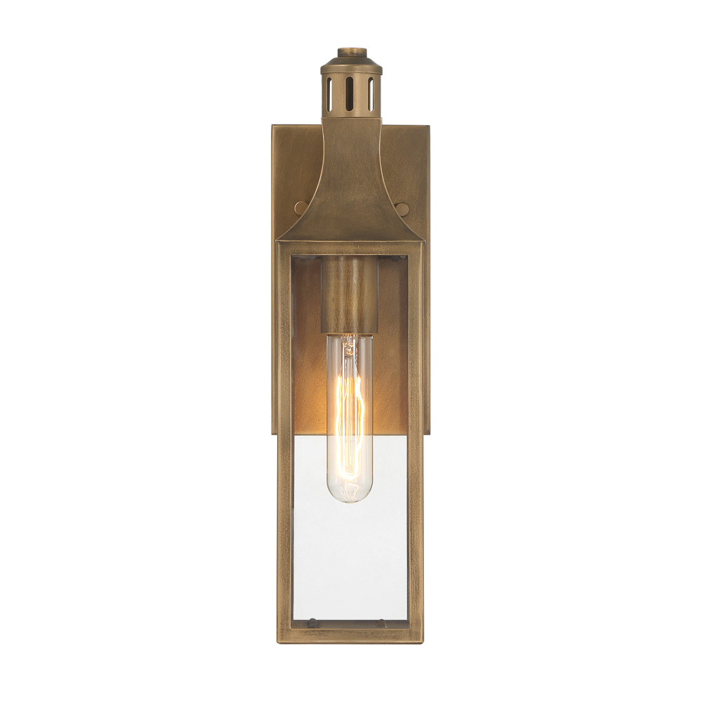 Compact yet full of character, the Savoy House Lancaster 1-light outdoor wall lantern adds traditional refinement to tight spaces and intimate entryways. Its classic architecture, clear glass, and Atlas Bronze finish work together to deliver warm, purposeful illumination. Lancaster measures 15.88" tall, 4.5" wide, and extends 5.25" from the wall. Uses one standard bulb of up to 60 watts (not included). Wet area rated.