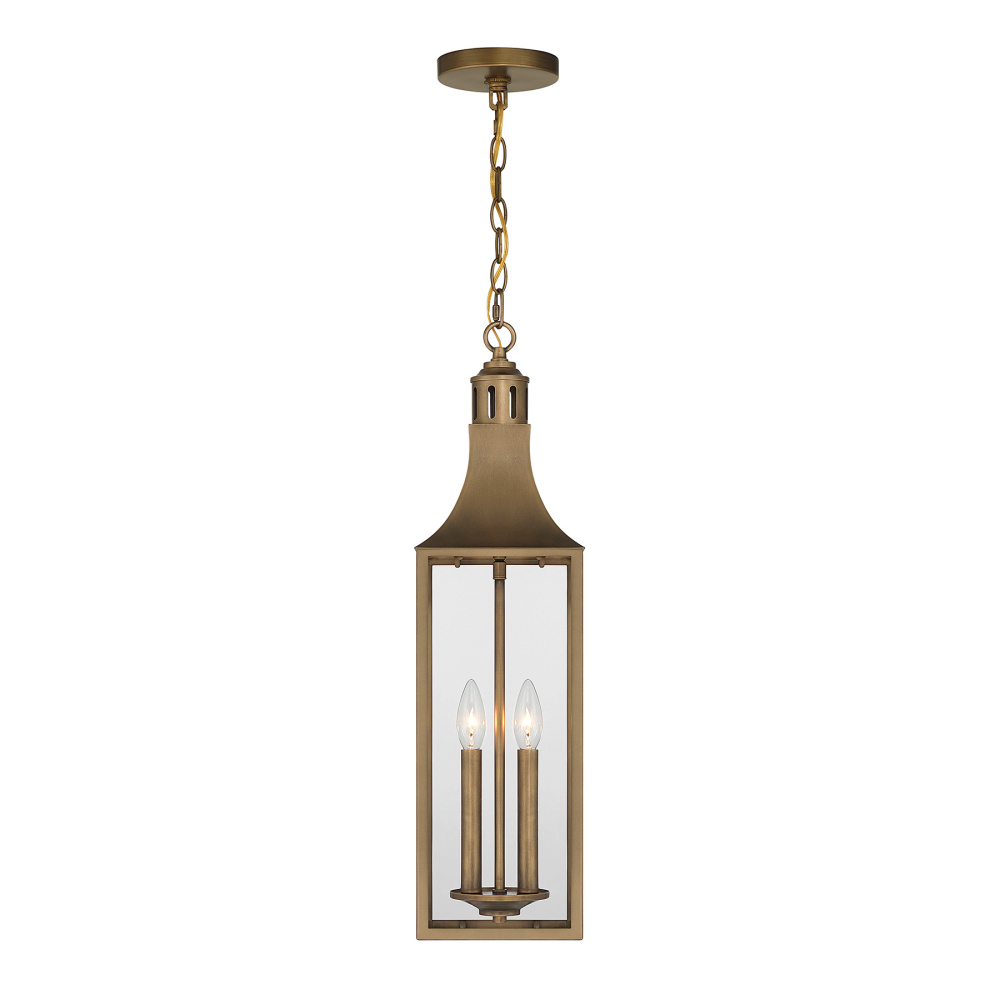 Light the way home with the refined, classic presence of the Savoy House Lancaster 2-light outdoor hanging lantern. Its elongated silhouette, gently arched rooftop, and chimney detail create a look rooted in traditional charm. Clear glass panels showcase a welcoming wash of light while the Atlas Bronze finish brings warmth and depth. Perfect for covered porches and entries, this pendant stands at 25.25" high and 7" wide. Uses two candelabra bulbs of up to 60 watts each (not included). Includes 120" of chain. Damp area rated.