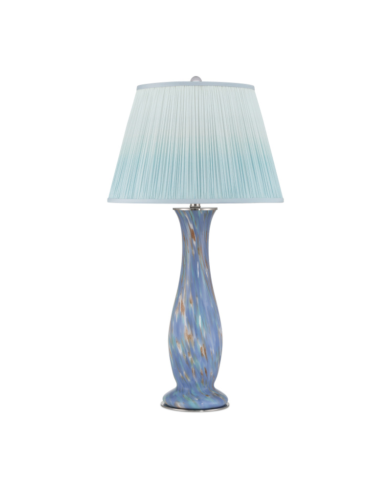 The Lapis Blue Table Lamp has a gleaming glass body on which streaks of white, deep blue, and iridescent copper twist together to create a mesmerizing Easter-egg effect. Fitted with a pleated ombré blue shade, the body was inspired by the tallest vase the prominent French glassmaker and designer Charles Schneider ever made. The swirling pattern brings the lamp a strong sense of movement achieved through a painstaking combination of marbling and glass-fusing techniques, which are difficult to do in tandem.