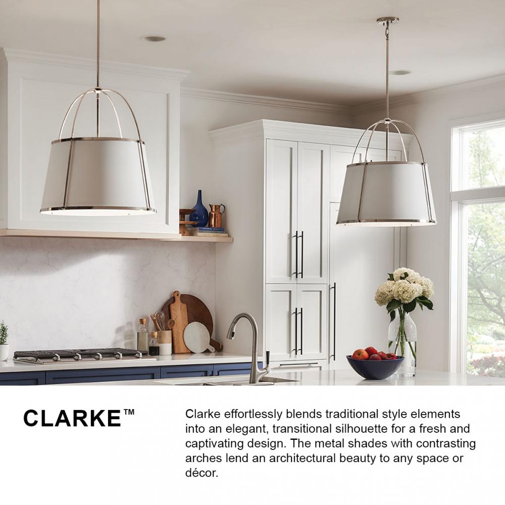 An effortless blend of classic style elements, Clarke’s transitional design is fresh and elegant. Its captivating metal or linen shade and contrasting frame lend architectural beauty to any space with a selection of sophisticated finishes to complement any décor aesthetic.