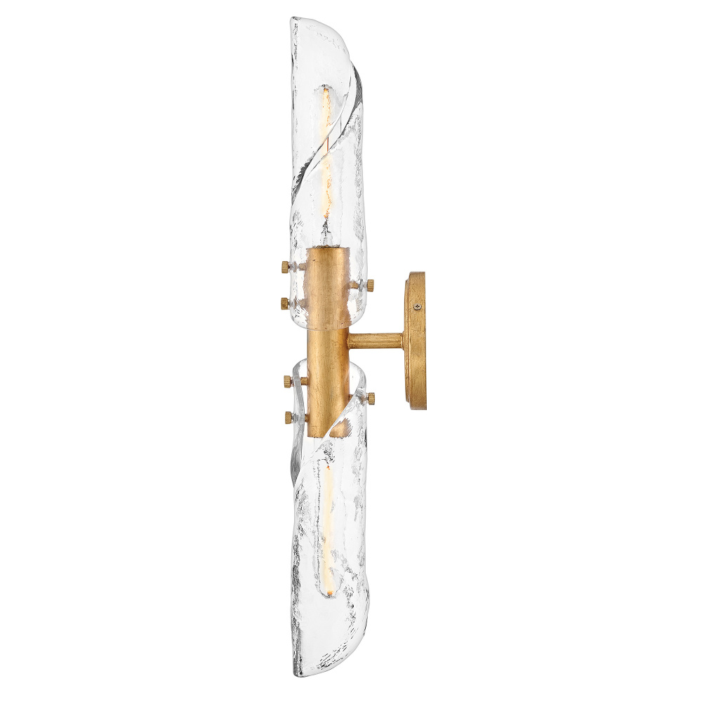 Evoking the movement of flowing water, Capri’s linear, clear glass shades are pressed to create a subtle crystalline texture, then twisted and shaped by hand. Metal backplates and rounded knobs finished in Black or Distressed Brass provide balance that anchors the organic form, resulting in a look that feels both refreshing and refined.