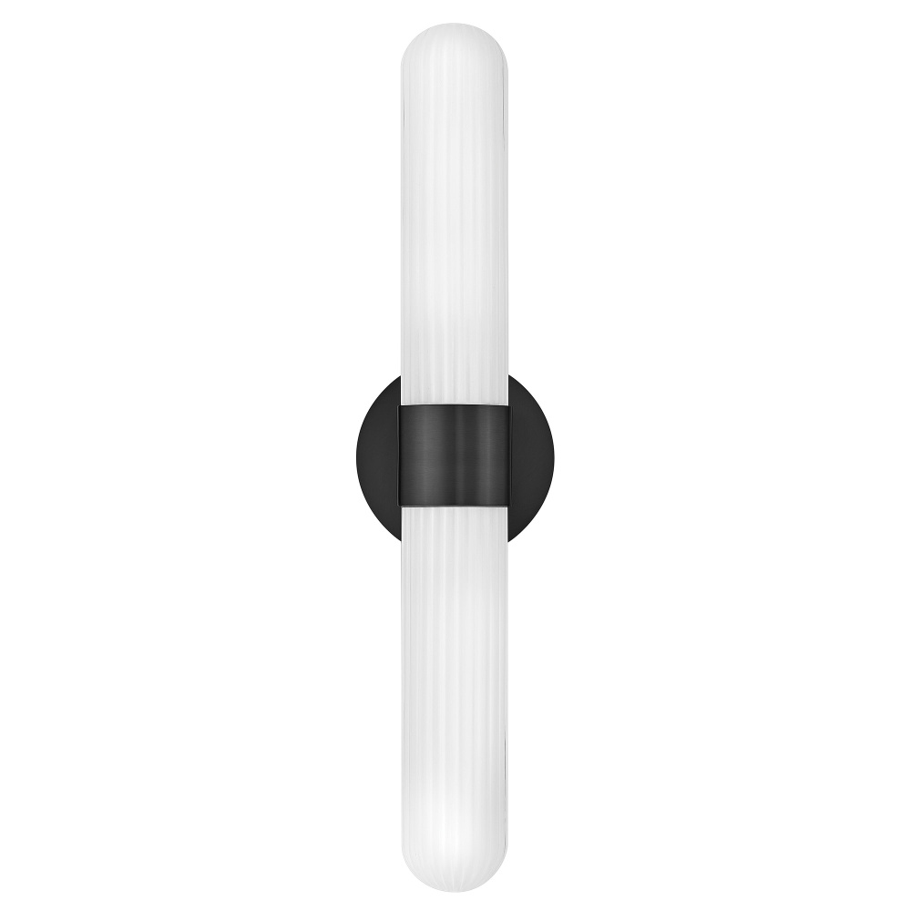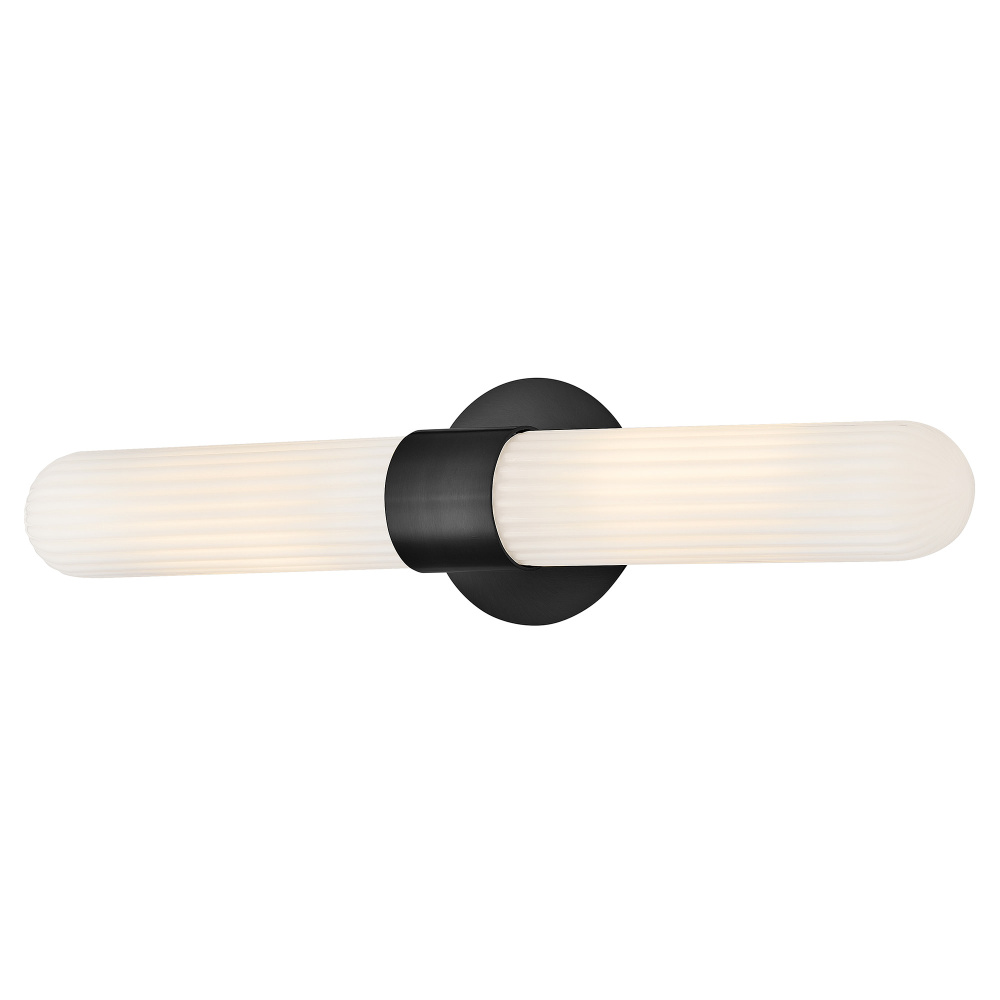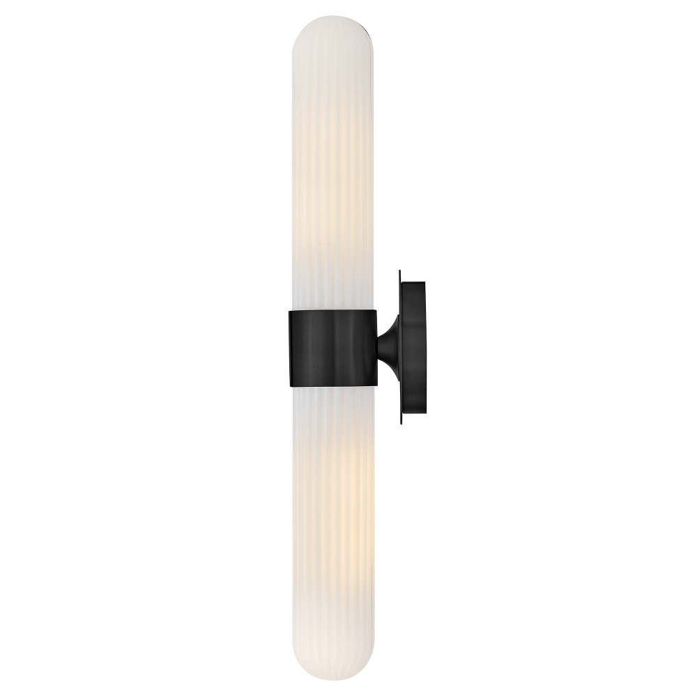 Blending transitional modern style with plenty of functional illumination, Nina is crafted to add a timeless accent to your bath or living space. Rounded Cased Opal glass shades with ribbed detailing glow beautifully, casting warm, even light throughout the surrounding room. A metal backplate and flared arm are finished in Black, Chrome, or Lacquered Brass to complement any decor effortlessly.