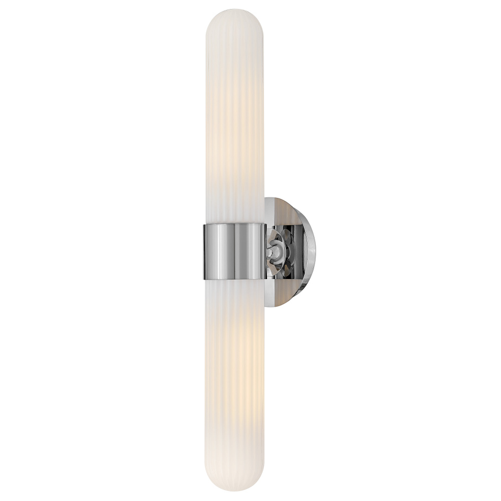 Blending transitional modern style with plenty of functional illumination, Nina is crafted to add a timeless accent to your bath or living space. Rounded Cased Opal glass shades with ribbed detailing glow beautifully, casting warm, even light throughout the surrounding room. A metal backplate and flared arm are finished in Black, Chrome, or Lacquered Brass to complement any decor effortlessly.