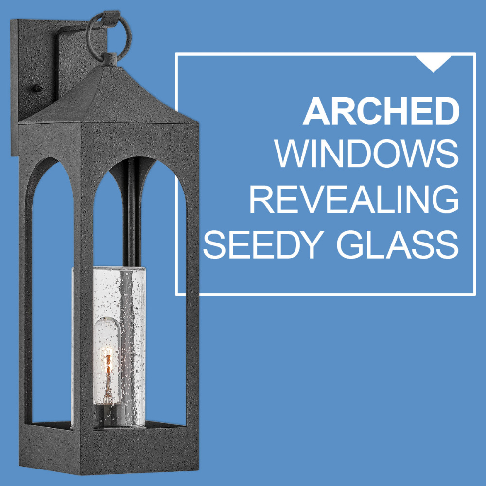 Amina is tradition with a flair. This lantern-inspired design features dramatic, arched windows revealing a seedy glass that creates a faux candle effect. Constructed of durable aluminum in a Distressed Zinc finish, Amina is complete with an oversized loop reinforcing its timeless appeal.