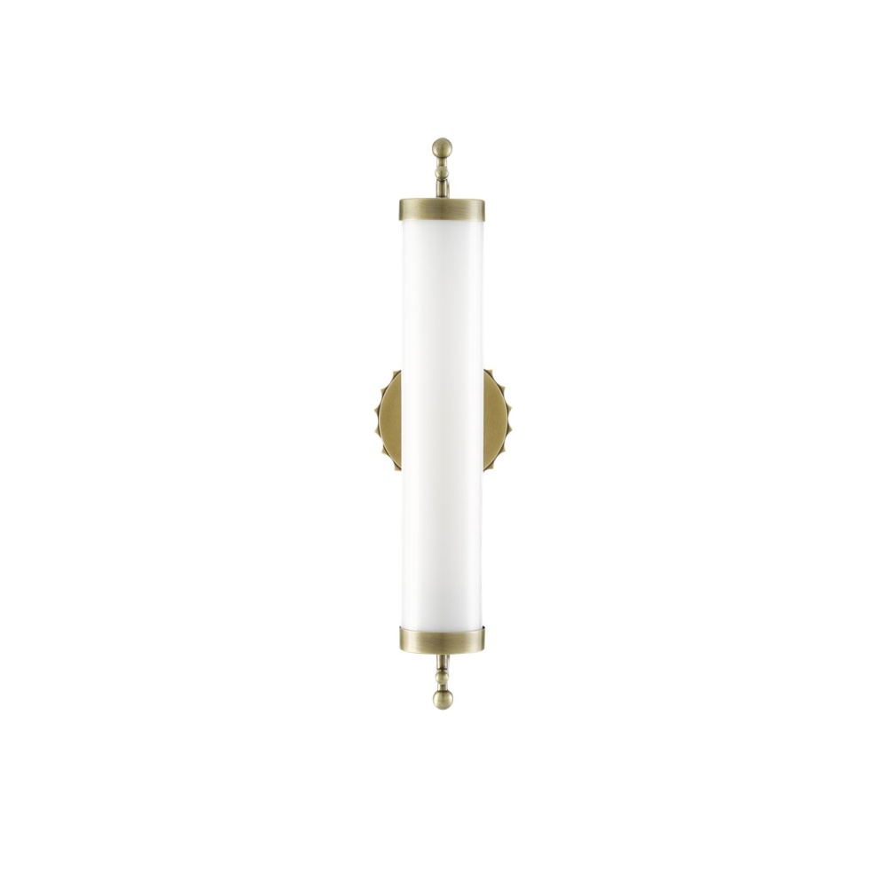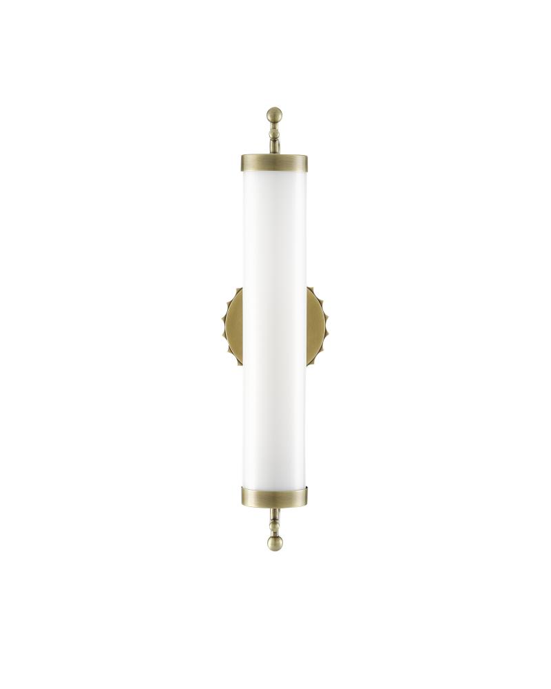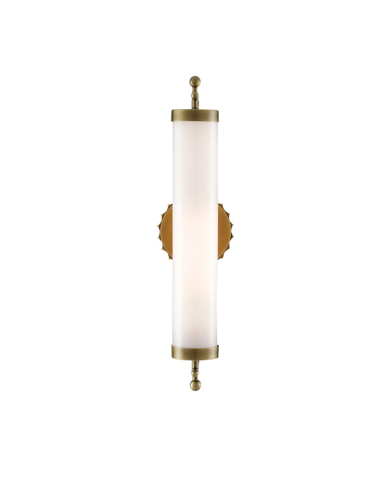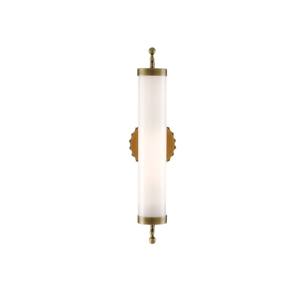 The Latimer Brass Wall Sconce in our Barry Goralnick Collection is made of metal in an antique brass finish and a tubular milk-glass shade. This gold sconce is certified for damp locations.