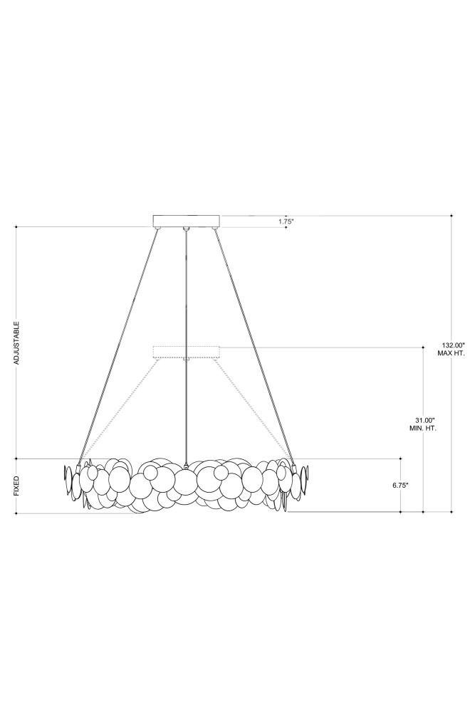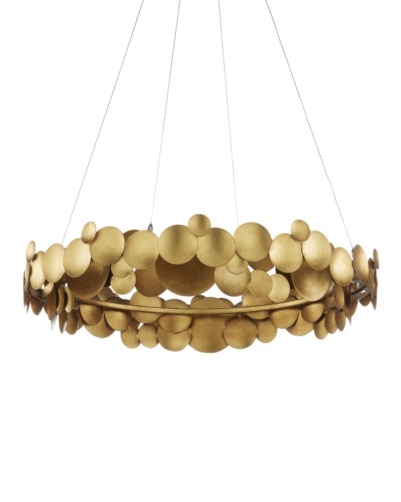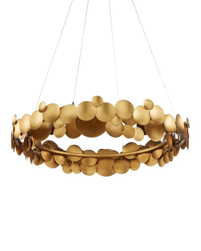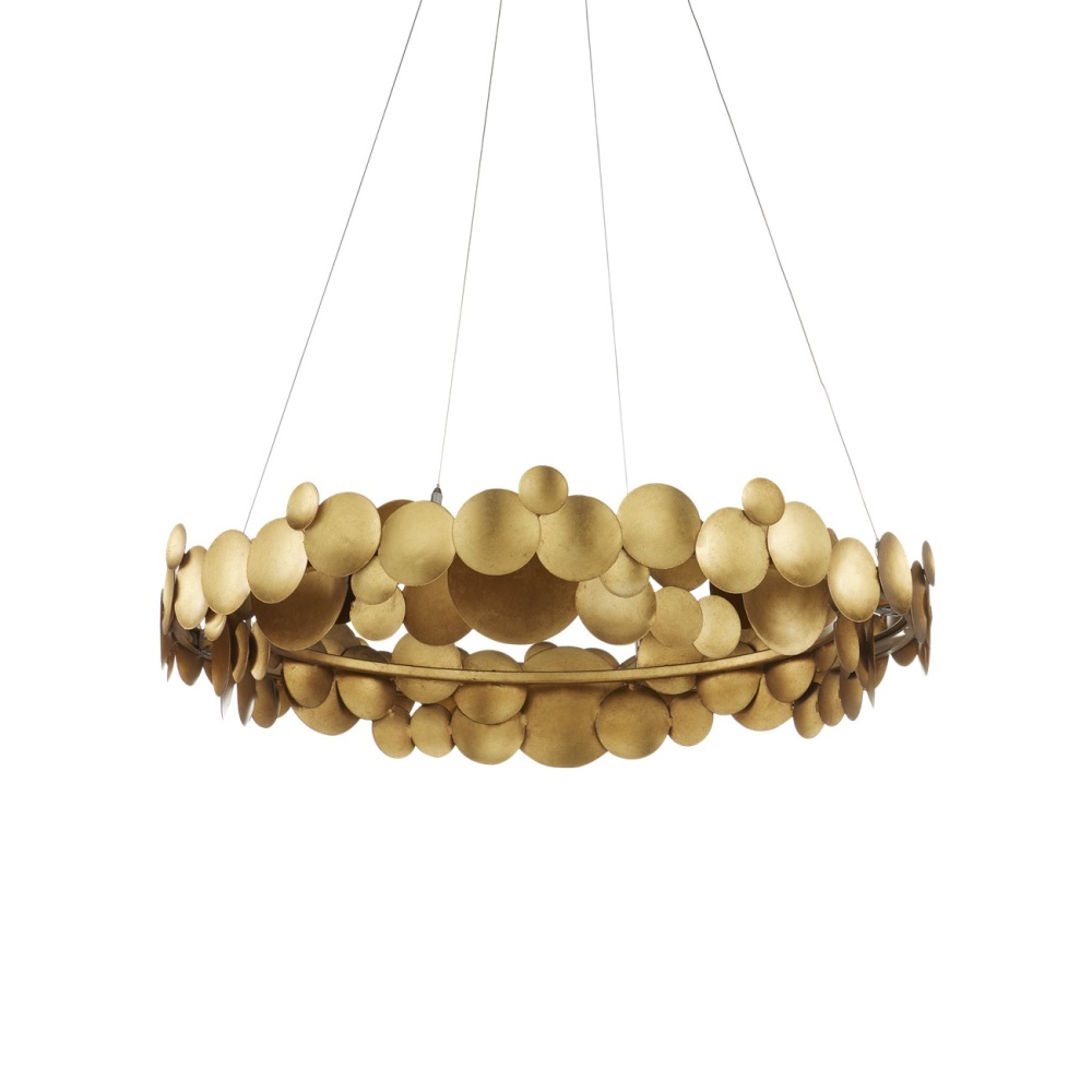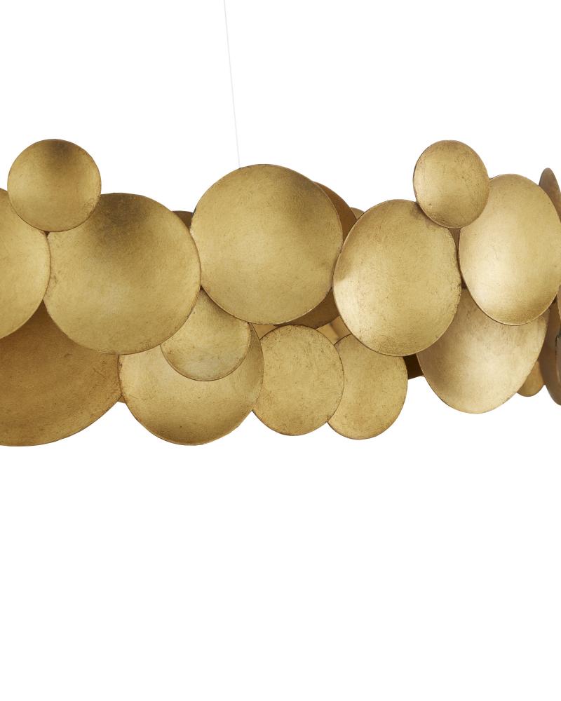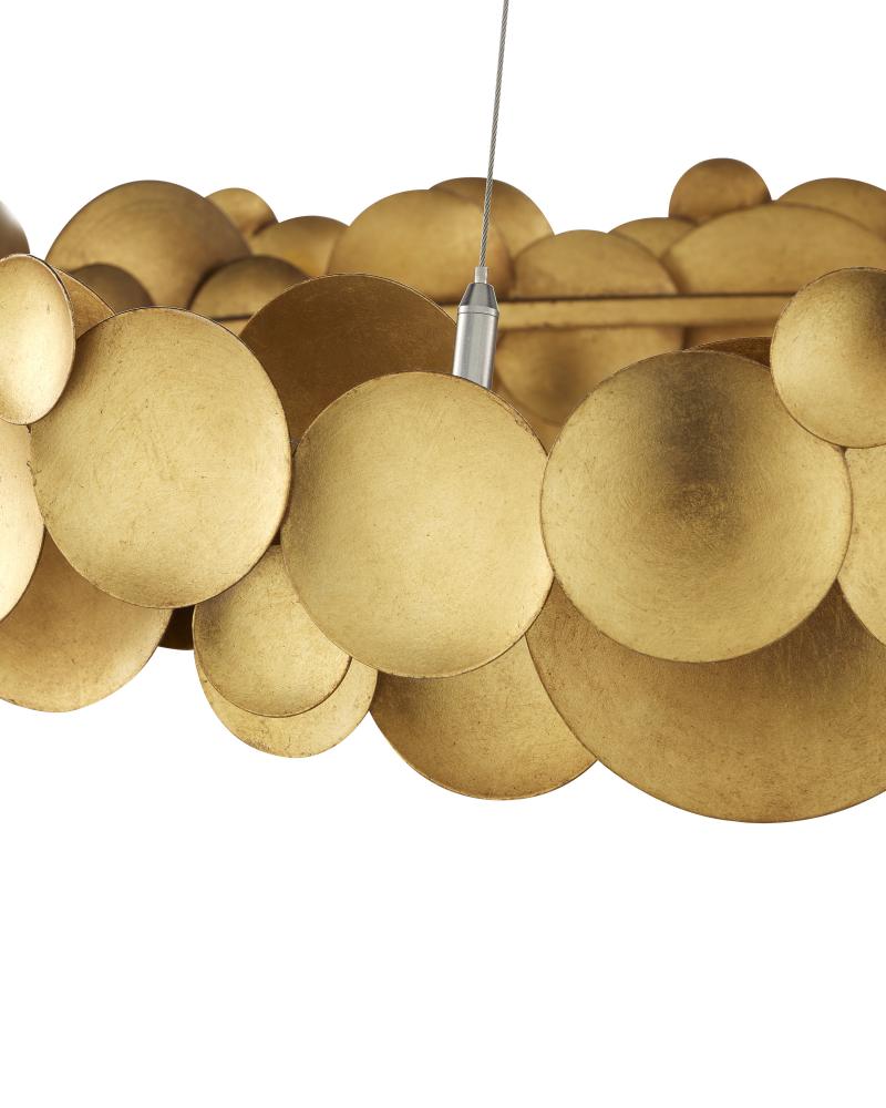 The Lavengro Chandelier is a layered design with a tremendous amount of charm. Wrought-iron discs in varying sizes are stacked in meandering patterns to form the shade. The contemporary gold leaf finish on the discs and the central bar gleams warmly, whether the lights are on or off. This modern chandelier is also innovative, featuring integrated LED technology for a sleek and efficient lighting solution. Adjustable from 31" to 124" with use of included chain/rod kit/cable. If your space calls for a longer drop, additional chain/rods/cable is available for purchase.