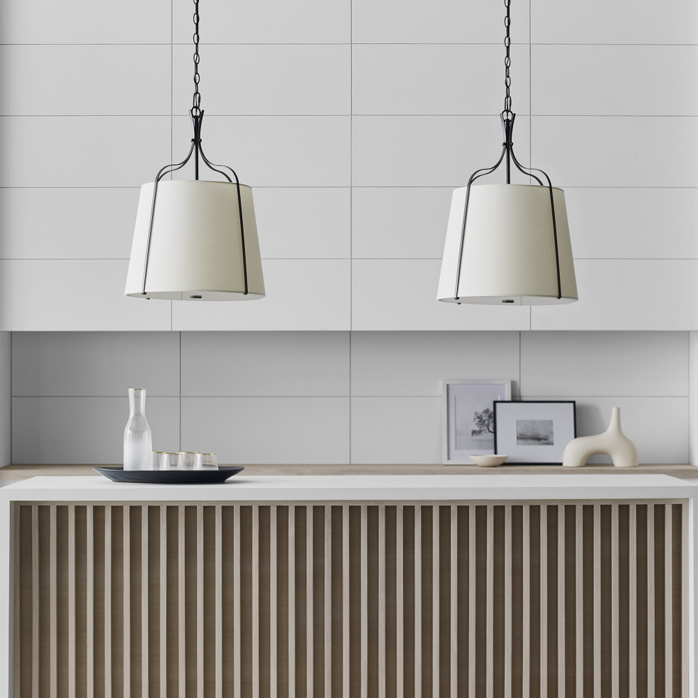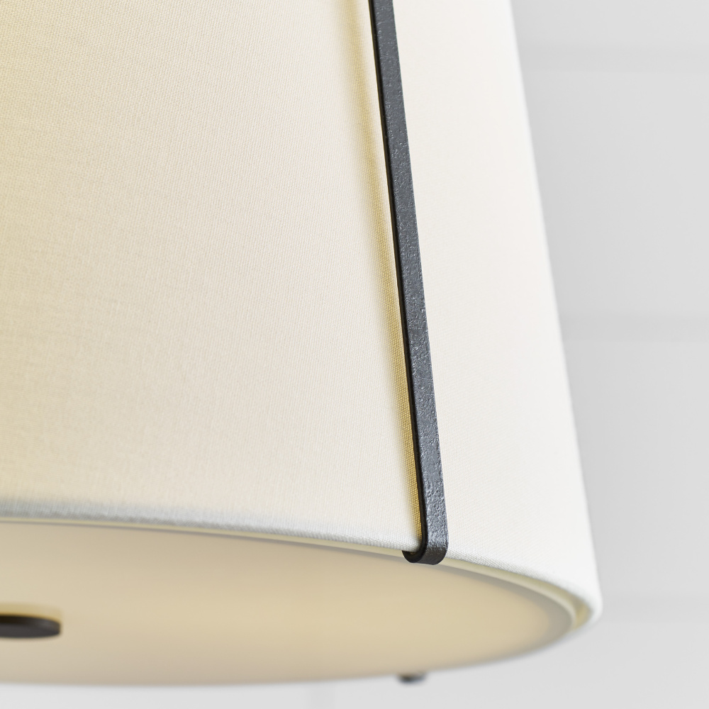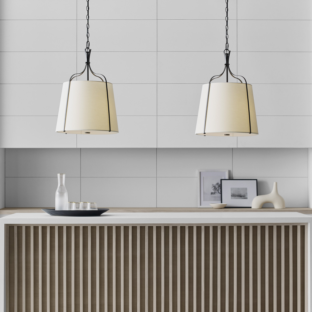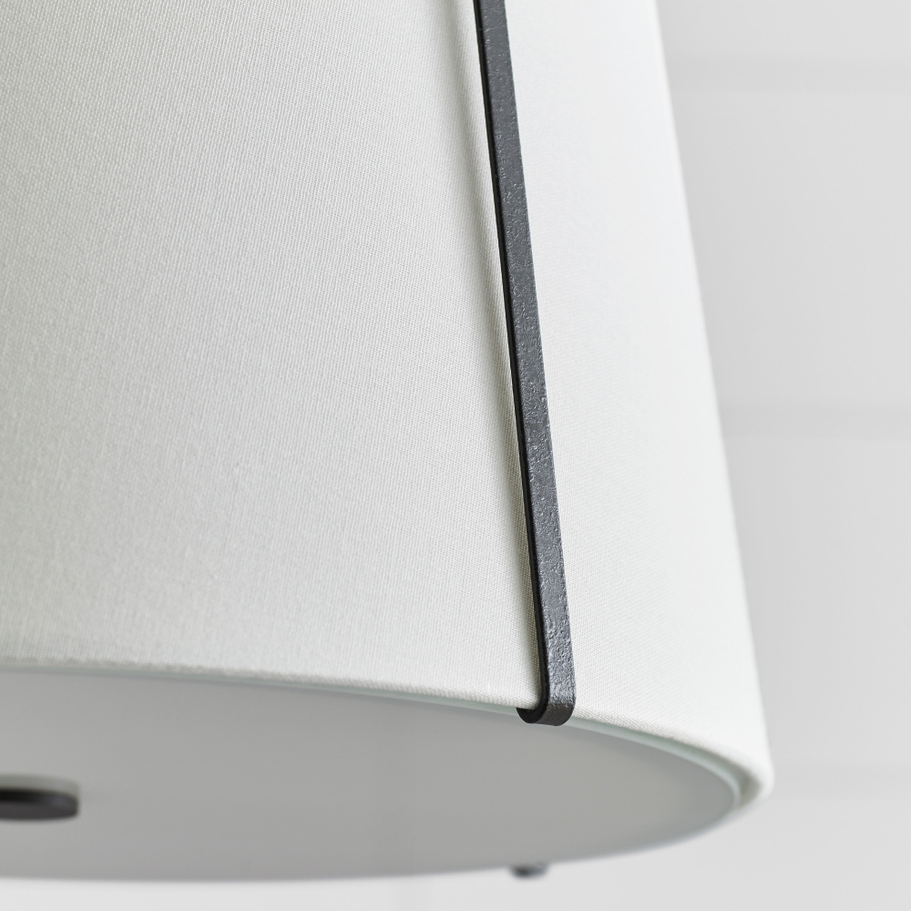 The Leander Pendant by Alexa Hampton makes an immediate impression in any space with its structural iron fixture ensconced in a linen barrel shade. Leander offers a modern twist on a classic lantern design Beautifully structured frame that maintains an open, airy feel
