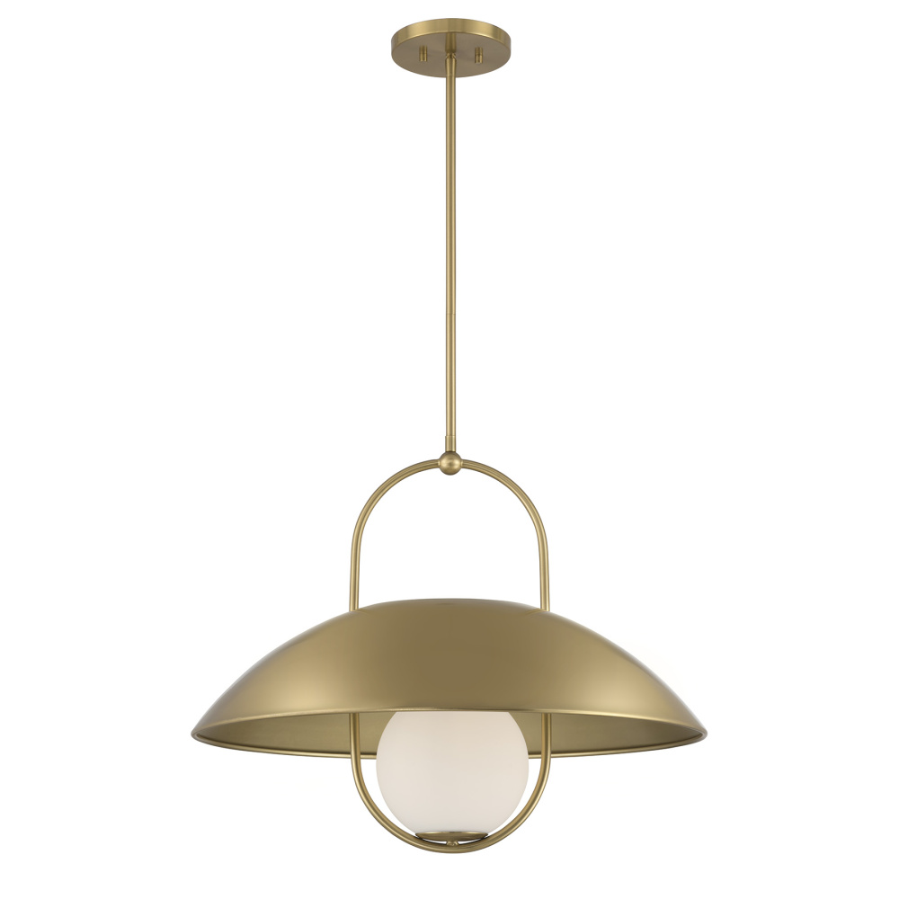 The Savoy House Lehigh 1-light pendant delivers a captivating blend of geometry and glow. An orb of white opal glass rests on a slender oval frame, crowned by a solid shade that focuses light downward while staying open at the top for an airy feel. The Warm Brass finish enriches the silhouette with inviting warmth. Lehigh is 22" in width and has an adjustable height ranging from 18.13" to 72.13". It uses one standard size bulb of up to 60 watts. Bulb not included. Comes with four 12" downrods and one 6" downrod.
