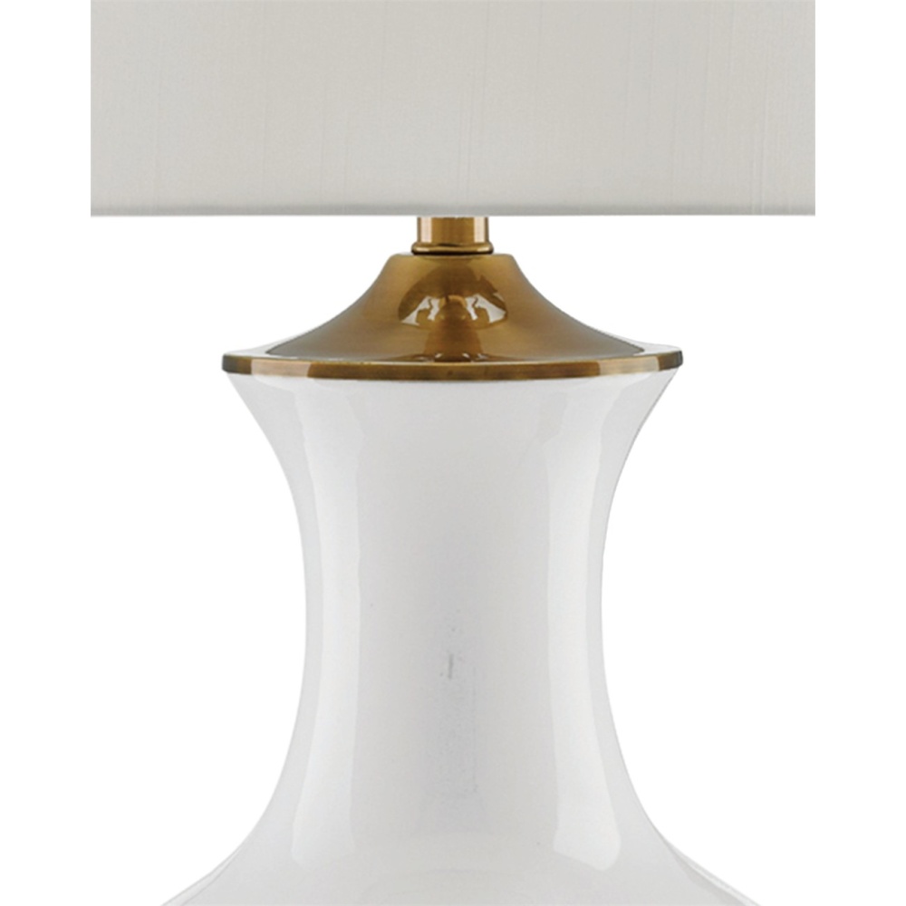 Serenity has a profile in the Lilou White Table Lamp with its lovely vase-like shape. Made of white ceramic with metal hardware in an antique brass finish, the lamp is topped with an off-white shantung drum shade.