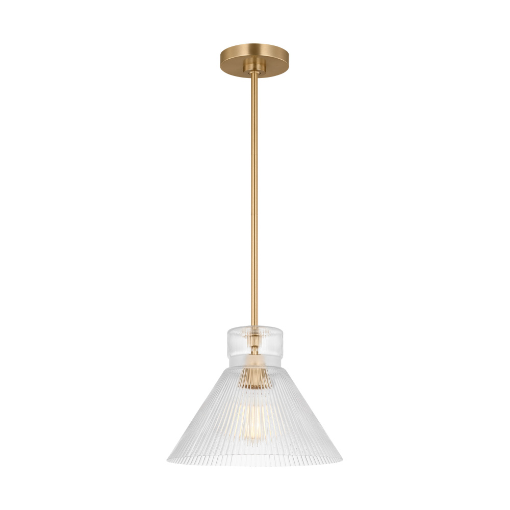 Crafted with Steel in a Satin Brass finish with clear ribbed glass shade