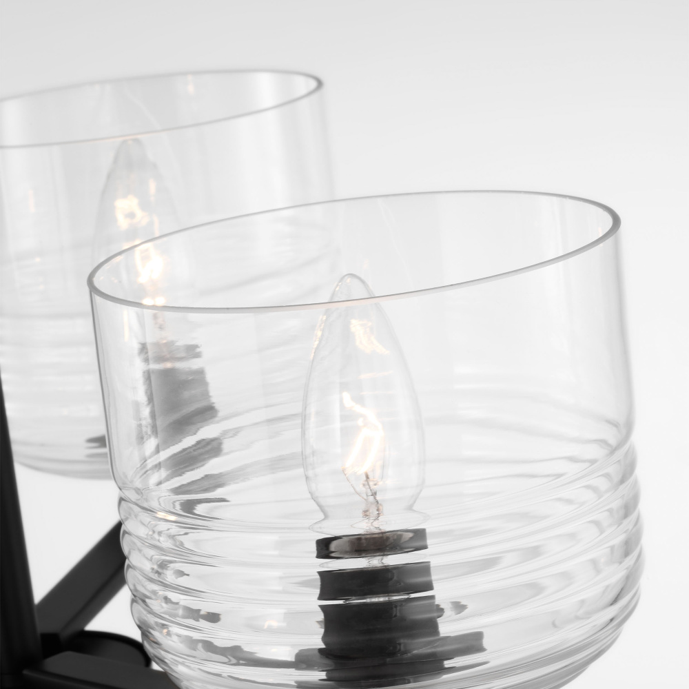 Crafted with Steel in a Midnight Black finish with clear ribbed glass shades