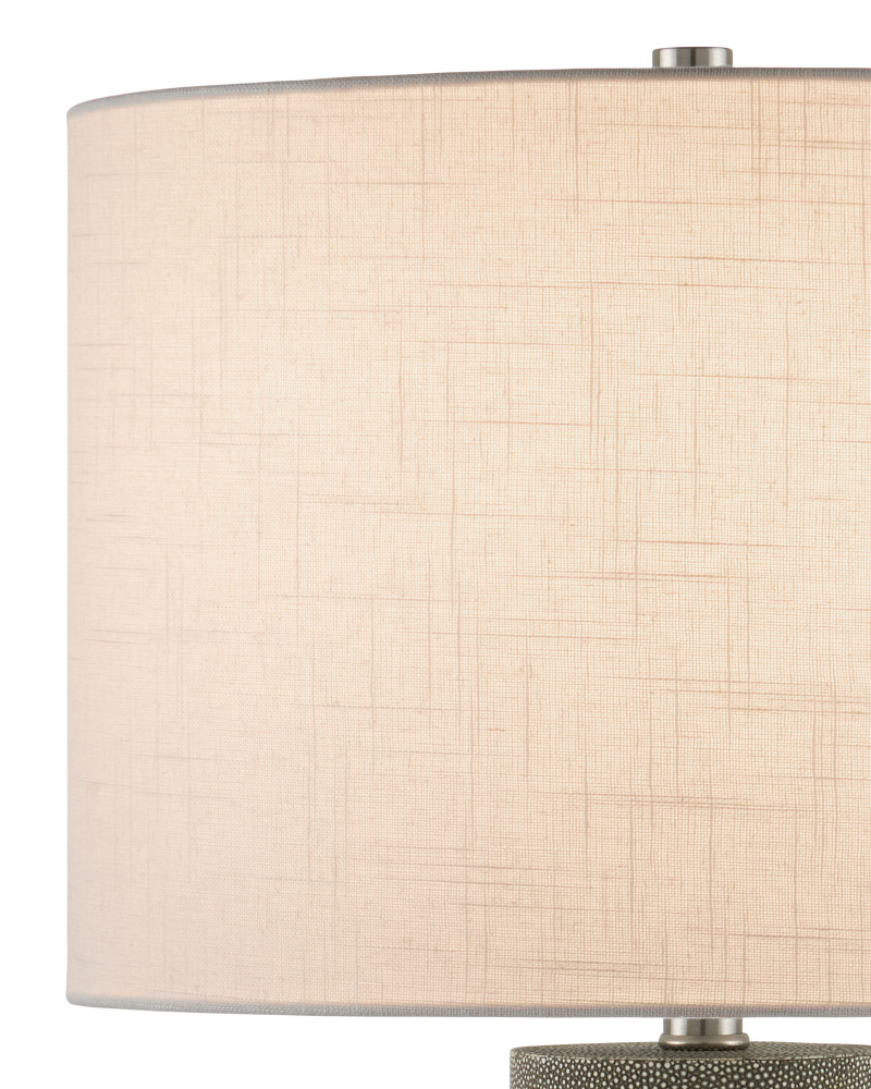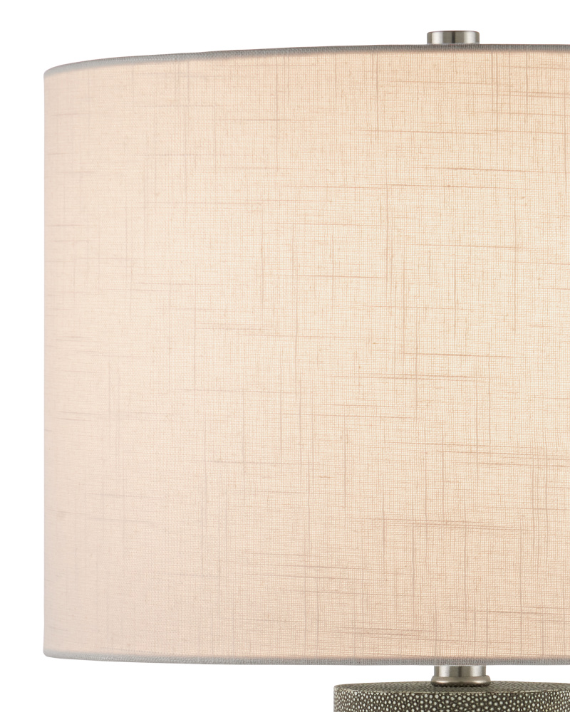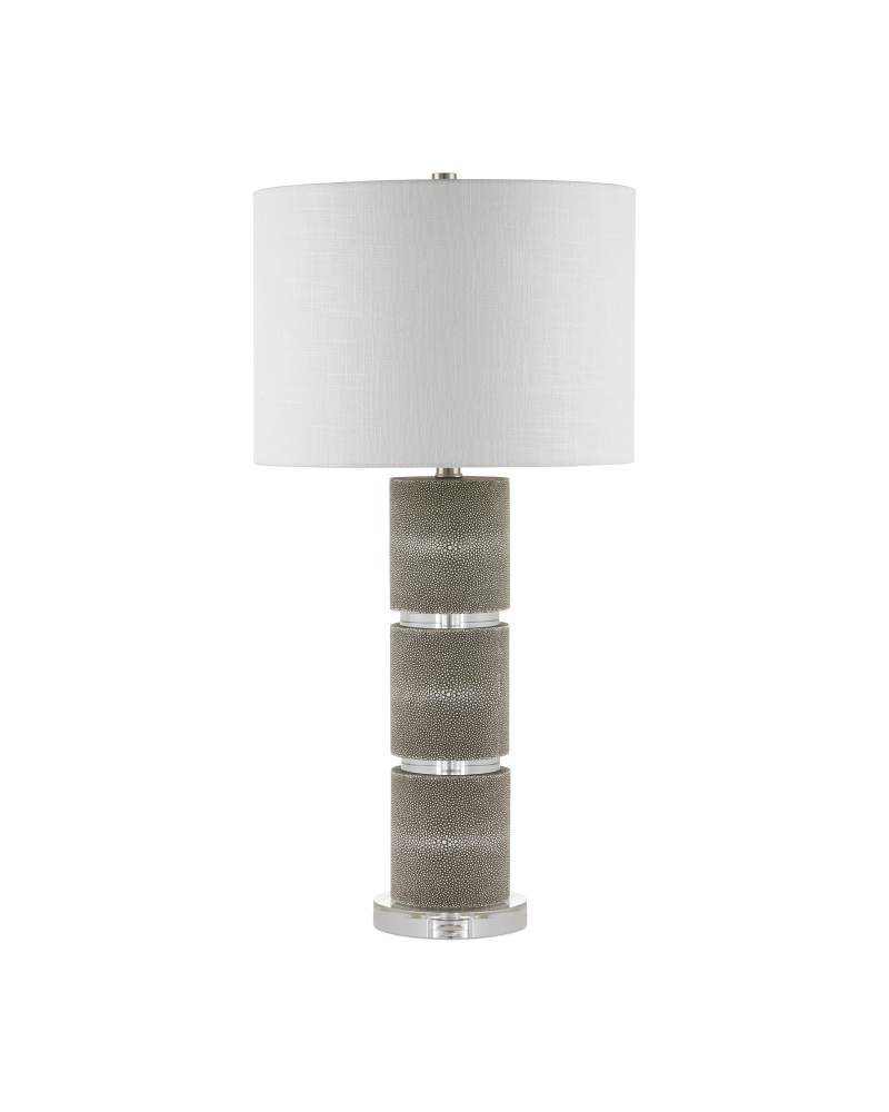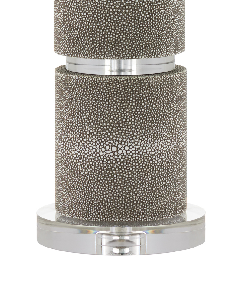 Cylinders of faux gray shagreen separated by rings of optic crystal make the Lofitt Table Lamp the epitome of luxe style. The slightly larger optic crystal base grounds the sophisticated profile with its stingray texture. The slubby linen shade with its weft and warp detailing contributes to the overall texture of the lamp.