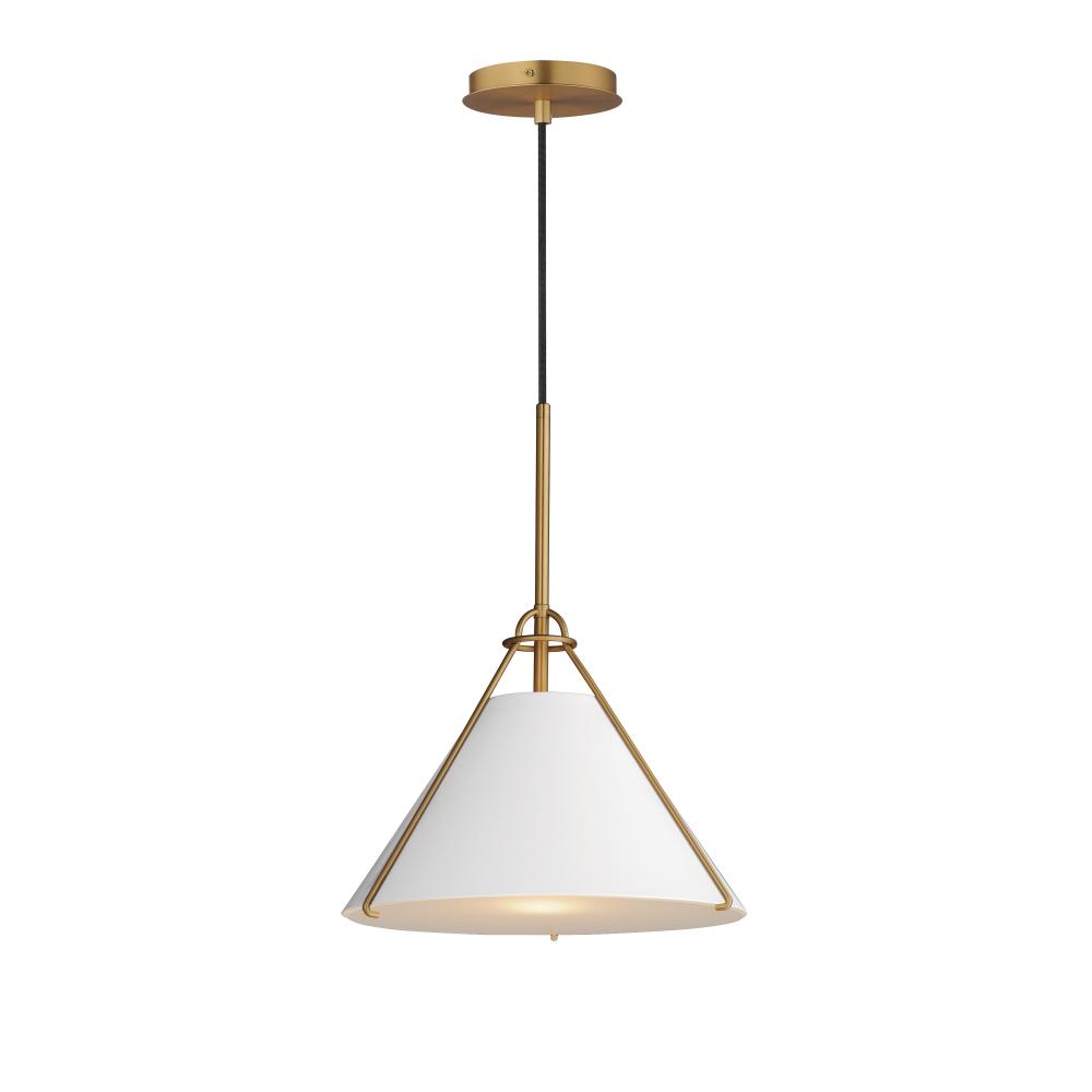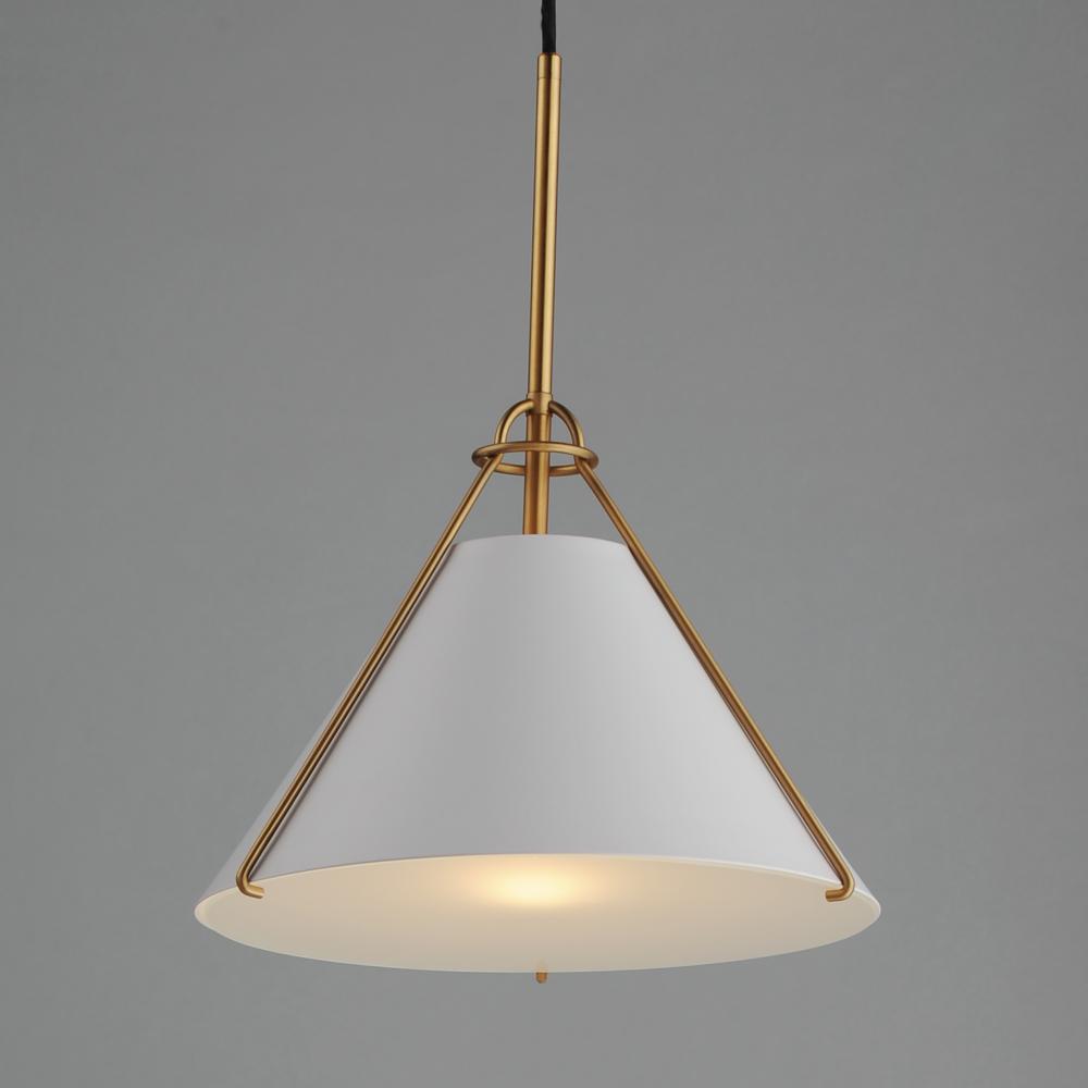 Metal shades of Light French Gray, Black or Matte White are suspended from halos of contrasting Natural Aged Brass finish. Maximizing the light output, the interior of the shades are painted white, and their tops are left open casting light both upwards an