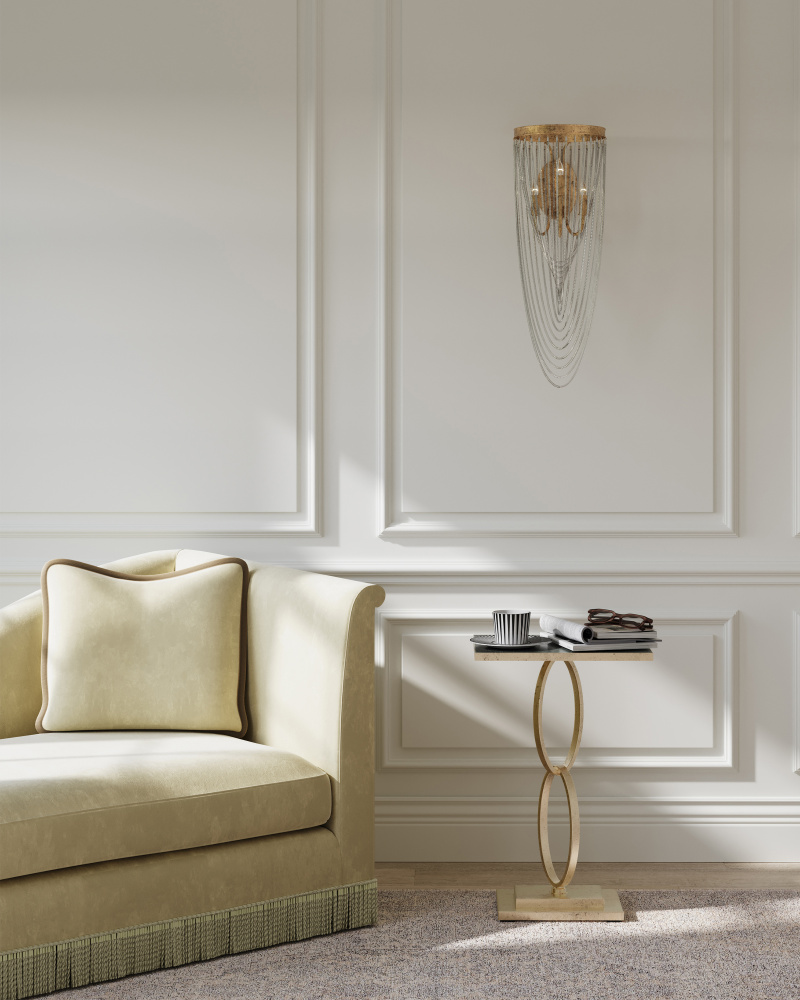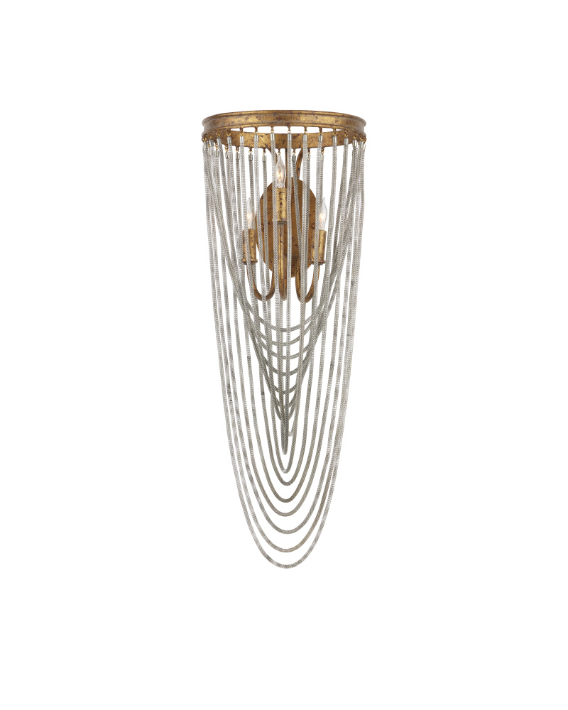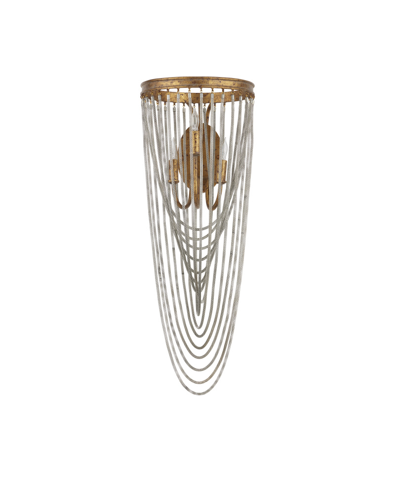The dainty chains looping from point to point on the circular ring of the Lucien Wall Sconce are draped methodically and intentionally in a crisscross pattern. These bring this gold wrought iron sconce a sense of old world style, which is furthered by the French gold leaf finish on the metal. This gold sconce will grace a space like a piece of jewelry.