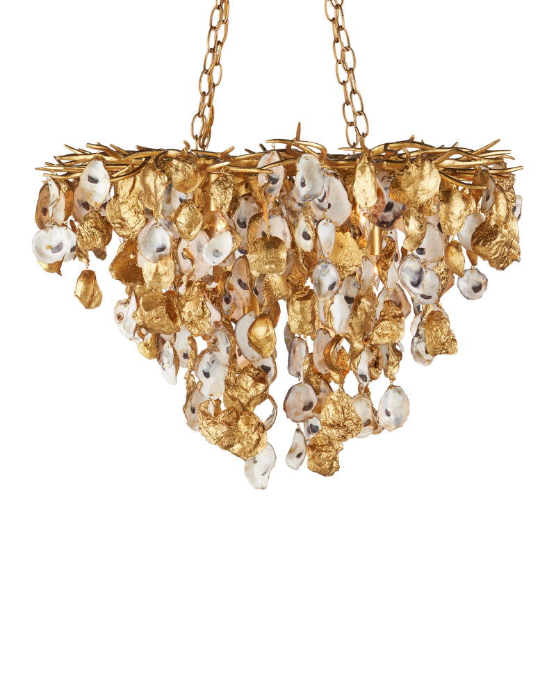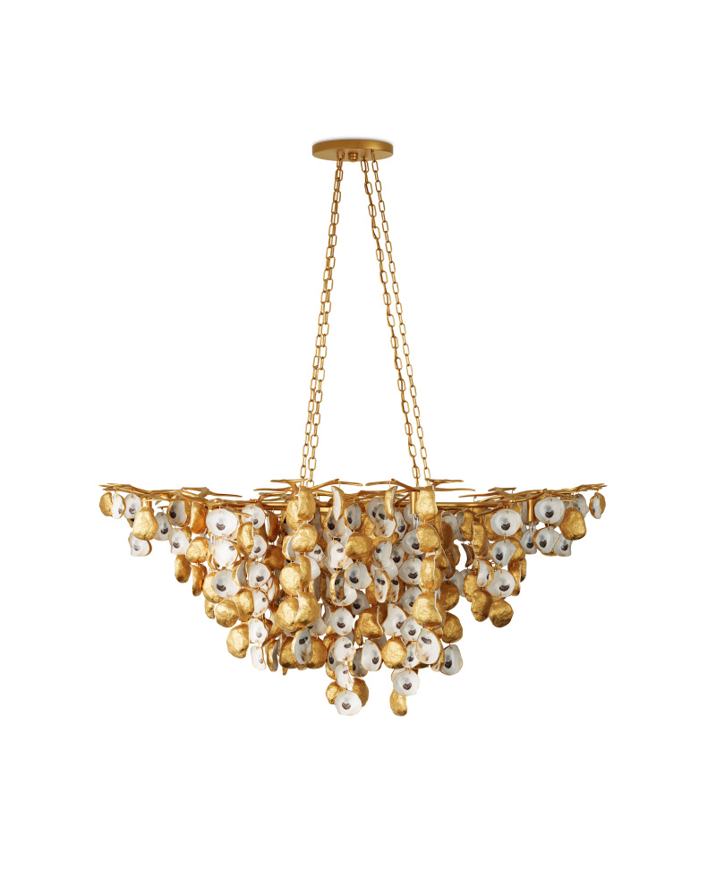 As its name reflects, the Lucullan Gold Chandelier is the epitome of extravagance and profusion. Humble oyster shells have been transformed into a sumptuous sculpture with their exterior surfaces painted in a contemporary gold leaf finish that matches the frame from which they dangle. The rough structure that swells outward to create an implied oval is a work of art in itself. Adjustable from 32" to 90" with use of included chain/rod kit/cable. If your space calls for a longer drop, additional chain/rods/cable is available for purchase.
